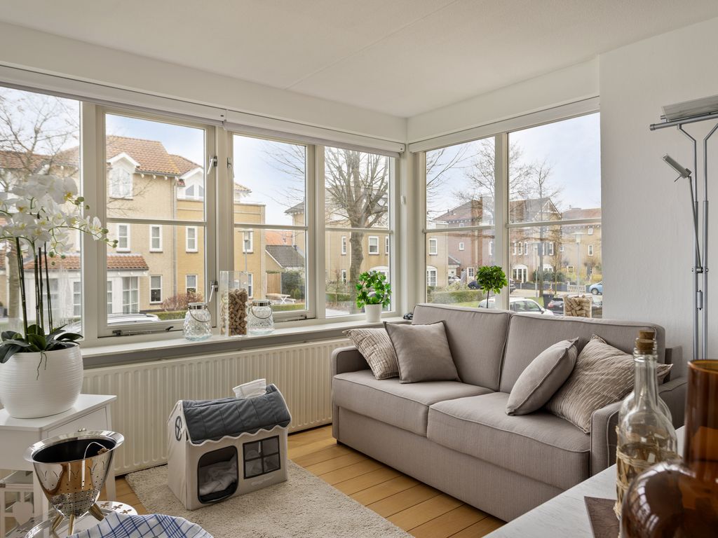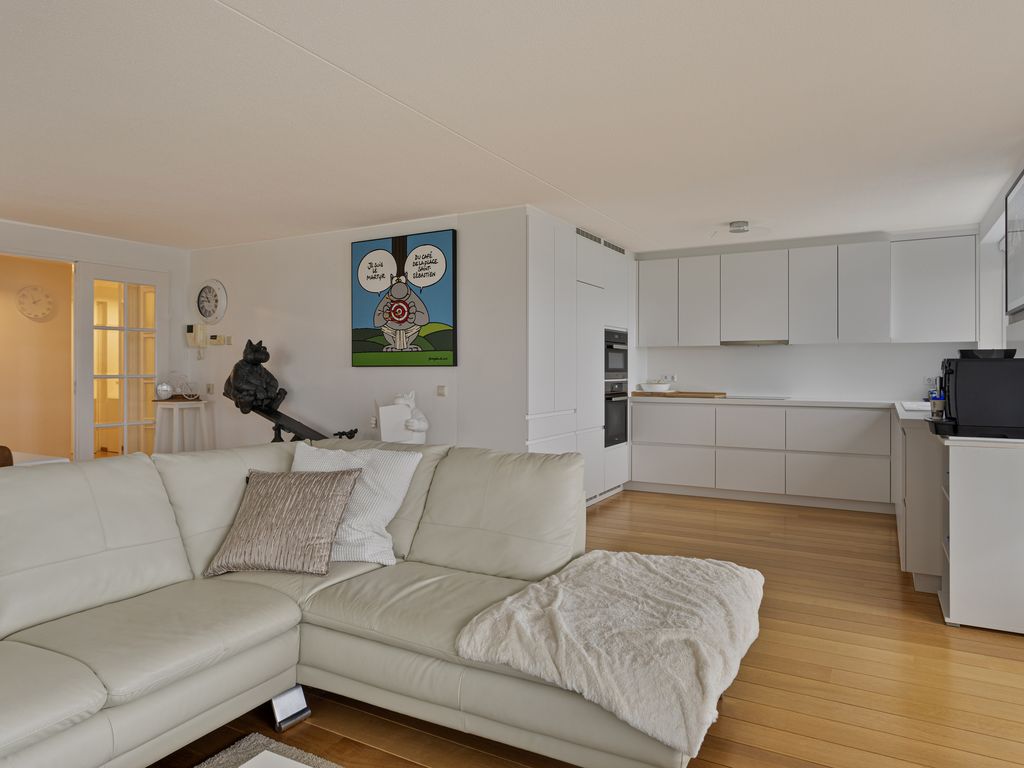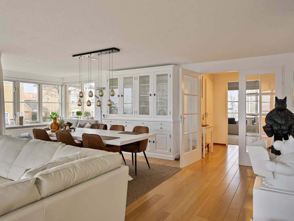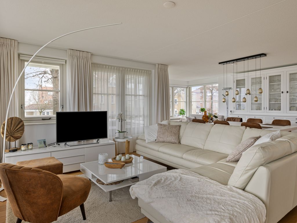 De royale afmetingen van de woonkamer maken diverse leuke opstellingen mogelijk. Door de grote raampartijen met openslaande deuren, die toegang geven tot het ca. 18 m² grote overkapte balkon/terras, is het er altijd heerlijk licht.