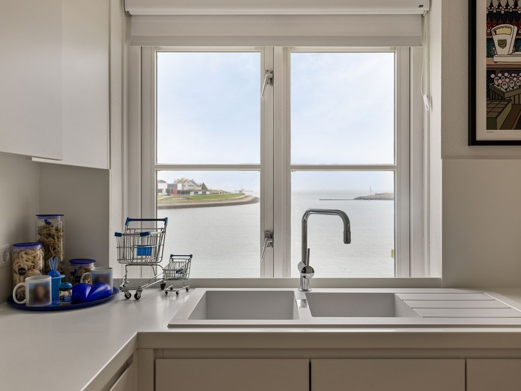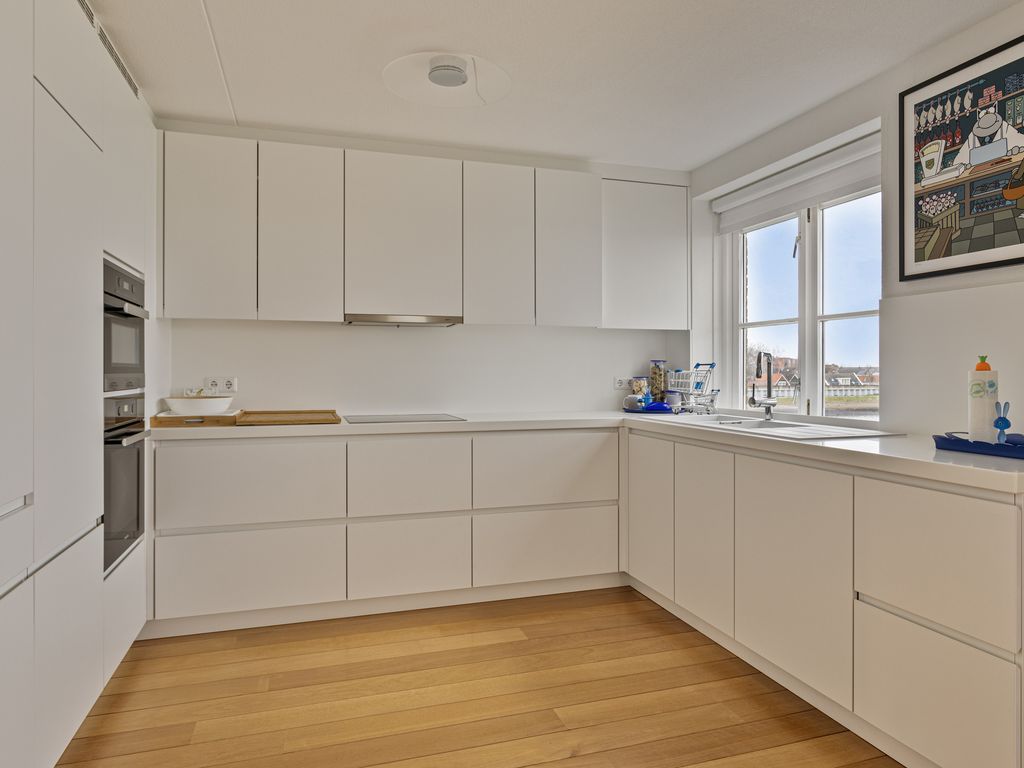 De luxe keuken staat in halfopen verbinding met de woonkamer en ligt aan de waterzijde van het appartement. U heeft daardoor ook vanuit de keuken een prachtig uitzicht op de haven.
