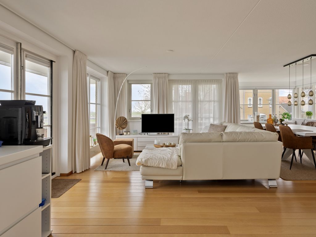 Via twee openslaande (glaspaneel)deuren bereikt u de royale sfeervolle woonkamer, die gecombineerd is met een luxe keuken (ca. 8 m²). Bij binnenkomst in de L-vormige woonkamer (ca. 40 m²) zult u, zoals zovelen eerder voor u, getroffen worden door het magnifieke uitzicht. De op het noorden gelegen woonkamer biedt namelijk een fantastisch vrij uitzicht op de monding van de jachthaven en de Oosterschelde.