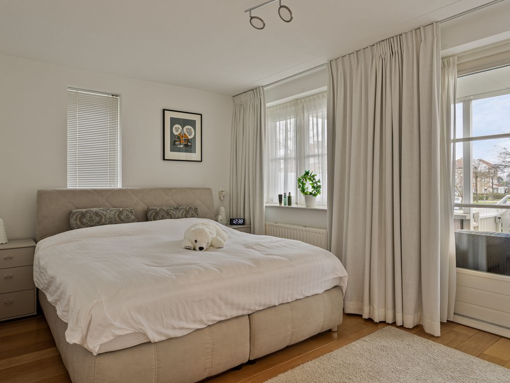 Via de centrale hal kunt u twee slaapkamers bereiken, waaronder de ouderslaapkamer (ca. 15 m²), die aan de zuidzijde van het appartement ligt. Deze slaapkamer heeft een kamerbrede inbouwkast met hang-/legsysteem en schuifdeuren. Fijn is ook de combinatie met het overkapte 13 m² grote balkon/terras, waarop u heerlijk kunt genieten van de zon. Er is genoeg ruimte voor een loungebankje en enkele stoelen.