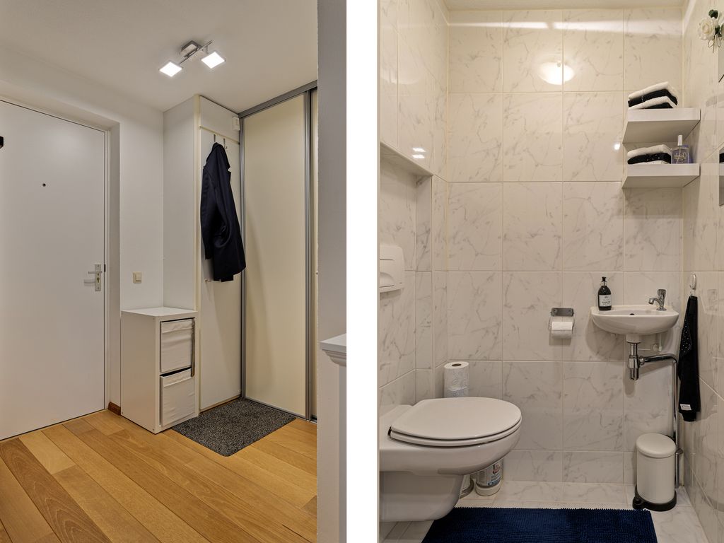 De ruime hal vormt het centrale deel van het appartement van waaruit u toegang heeft tot alle vertrekken. In de hal bevinden zich de meterkast, toiletruimte (met wandcloset en fonteintje) en een garderobehoek.