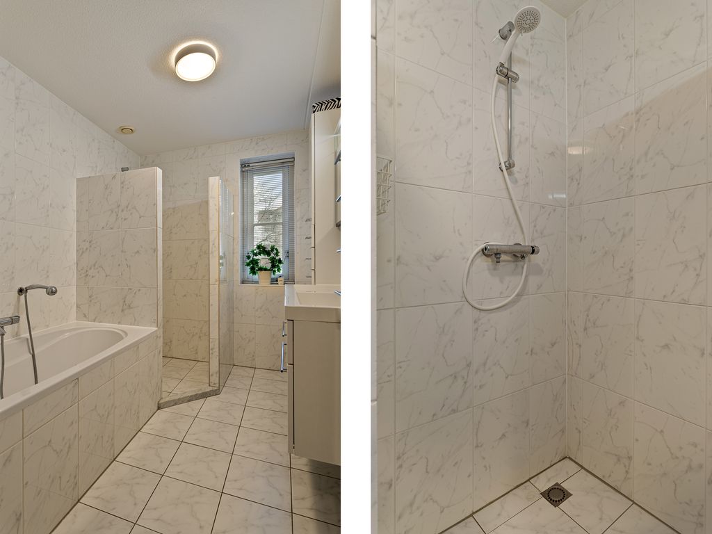 De geheel betegelde, ruime badkamer (ca. 6 m²) is compleet ingericht met ligbad, inloop douche, een wandmeubel met dubbele wastafel en spiegel- en wandkasten. Er is voorzien in een mechanische en natuurlijke ventilatie.