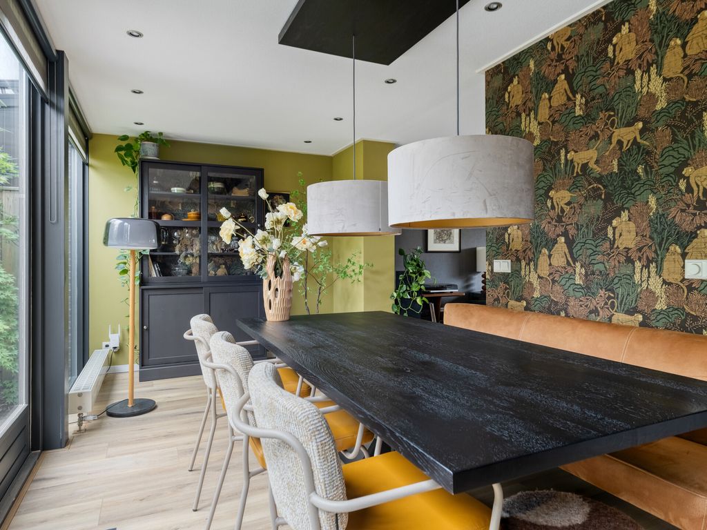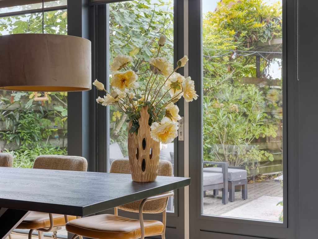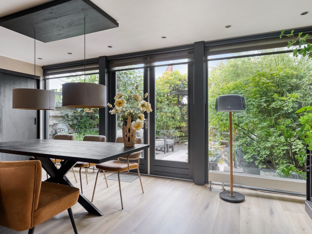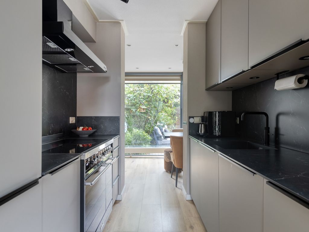 Via de verzorgde entree met beschutte voortuin betreedt u de hal met toilet, meterkast (12 groepen) met waterontharder, praktische berging, trapopgang met ruime trapkast en toegang tot de woonkamer. De woonkamer is dankzij de 3 meter diepe uitbouw aan de achterzijde verrassend ruim en licht. Grote raampartijen zorgen voor een prettige lichtinval en het geheel is stijlvol en doordacht afgewerkt. In de uitbouw bevindt zich de eetkamer, voorzien van een fraaie, op maat gemaakte inbouwkast. Via de dubbele tuindeuren loopt u zo de tuin in. Centraal in de woning ligt de moderne keuken, die in open verbinding staat met de woonkamer en eetkamer, maar toch een eigen plek behoudt. De keuken is uitgerust met diverse inbouwapparatuur, waaronder een Smeg-inductiefornuis met dubbele oven, afzuigkap, koelkast, vriezer, vaatwasser en Quooker. Ondanks het compacte formaat is er verrassend veel werkruimte.