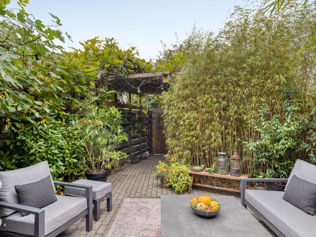 De achtertuin is onderhoudsvriendelijk en groen ingericht, met volop privacy. Achterin bevindt zich een royale schuur met ruimte voor fietsen, gereedschap en overige spullen. De achtertuin is bereikbaar via een achterom. Ook in de voortuin is het heerlijk toeven, door de beschutte ligging is het al vroeg in het jaar mogelijk hier van de zon te genieten.