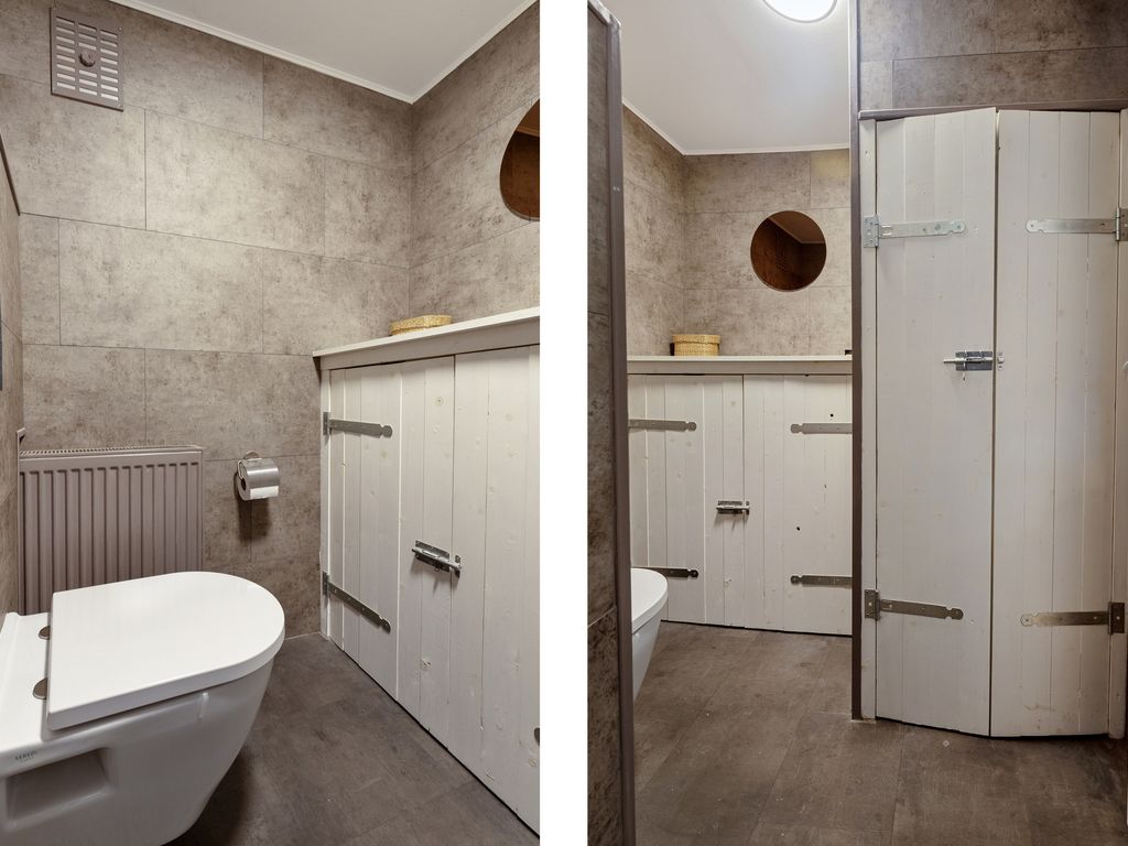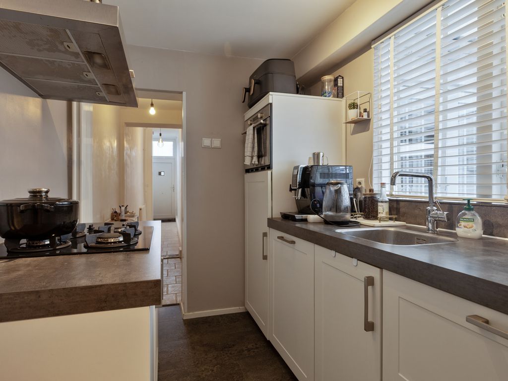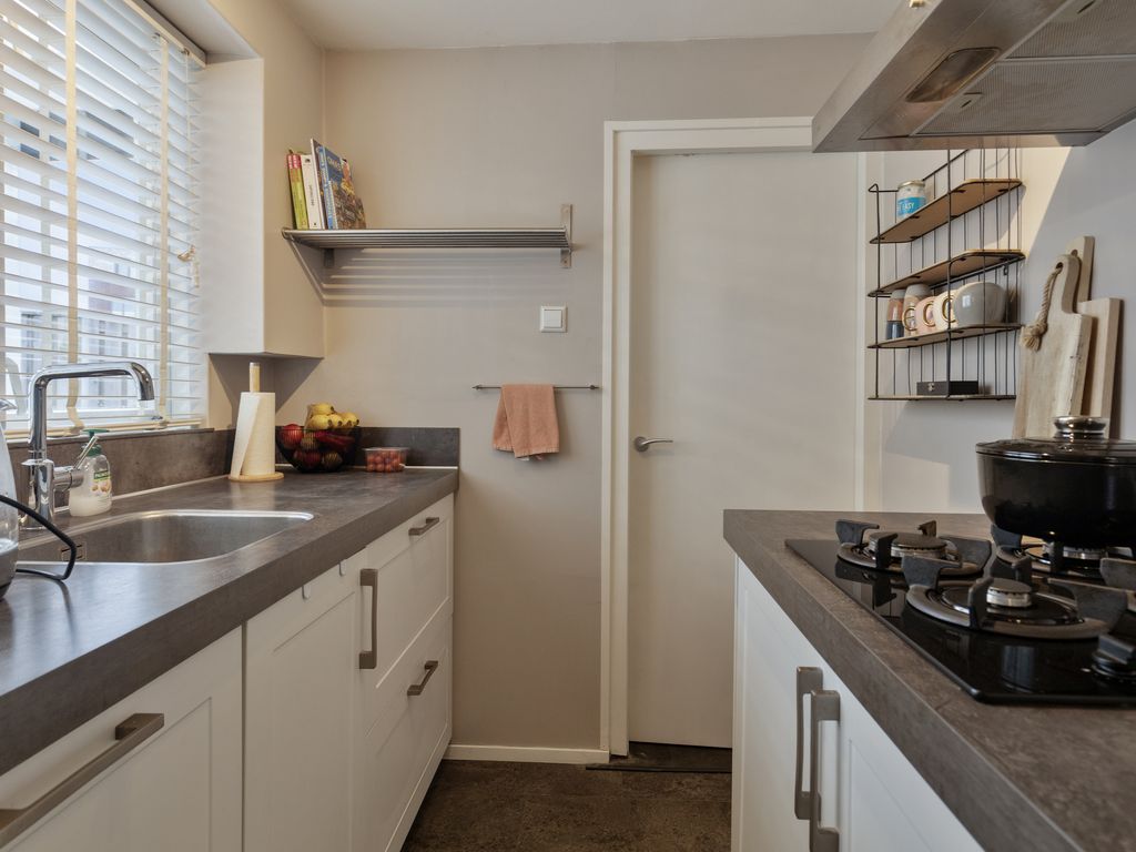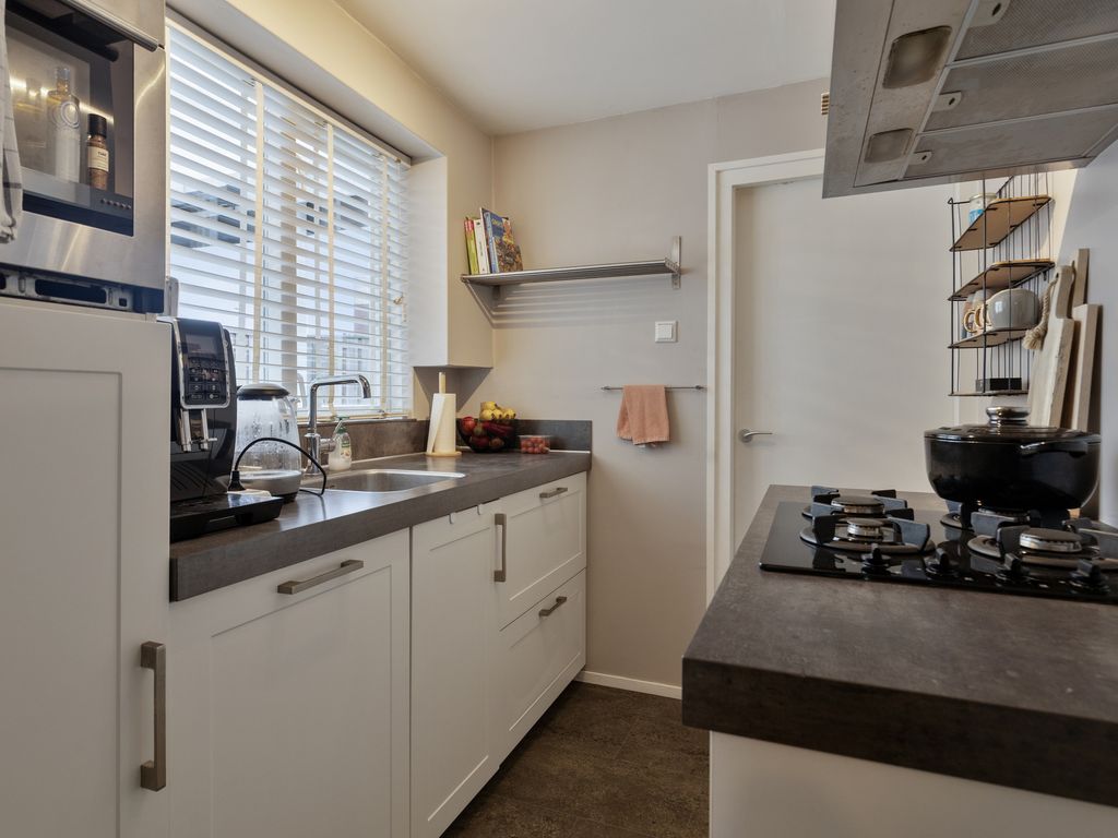De compacte keuken in lichte kleurstelling is praktisch ingericht en voorzien van een wasbak, koel-vriescombinatie, vaatwasser, combioven en een 4-pits gaskookplaat met afzuigkap. Vanuit de keuken heeft u tevens zicht op de achtertuin. Aansluitend aan de keuken bevind zich de toiletruimte met hierin een praktische kast met witgoedaansluitingen.