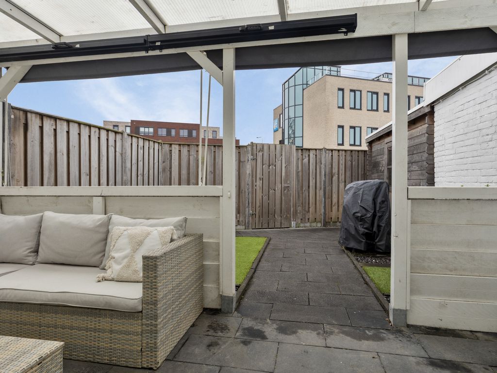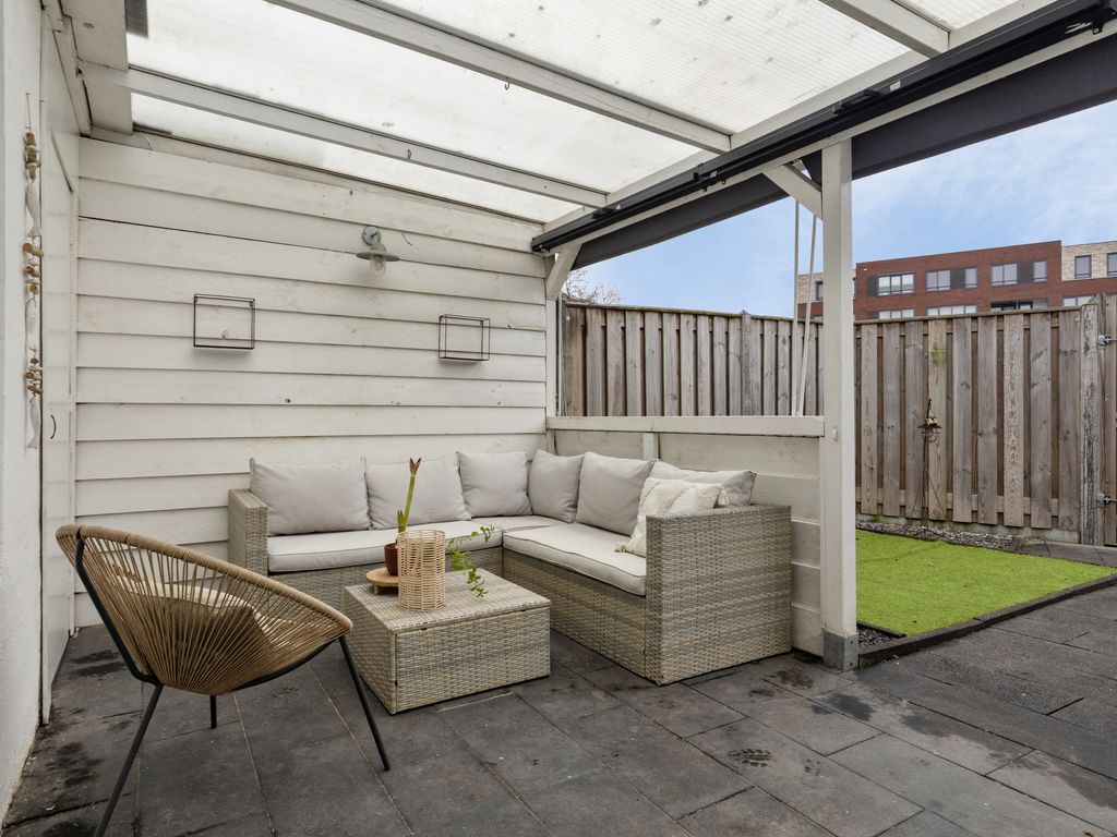 Vanuit de woonkamer stapt u direct de achtertuin in. De tuin is gesitueerd op het zuidwesten en profiteert van een gunstige bezonning. Direct aan de woning is een aangebouwde veranda gerealiseerd, waardoor u het hele jaar door beschut buiten kunt zitten. De tuin is onderhoudsvriendelijk aangelegd met kunstgras en een terras. Achterin staat een houten berging. De tuin beschikt over een poortdeur en vrije achterom.