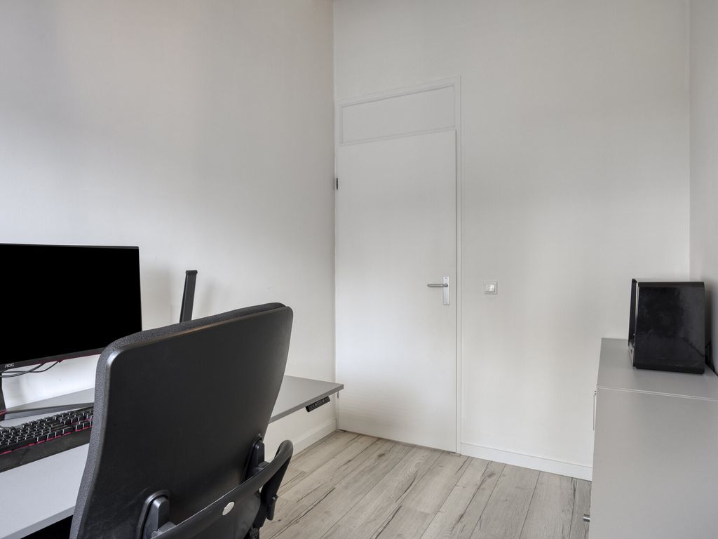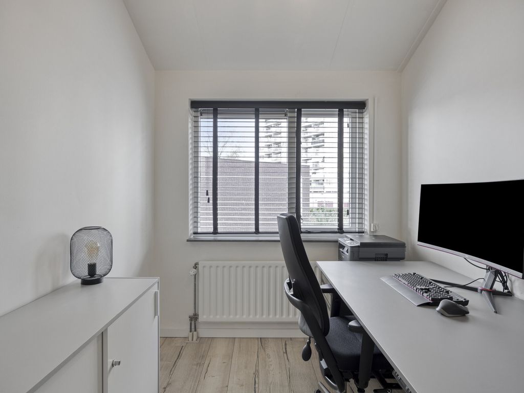 Op de eerste verdieping bevinden zich drie goed bemeten slaapkamers en een moderne badkamer met inloopdouche, wastafelmeubel en tweede toilet. De kleinste kamer bevind zich aan de voorzijde en is nu ingericht als kantoor, ideaal voor thuiswerken. Aan de voorzijde bevind zich ook de tweede slaapkamer terwijl de grootste slaapkamer en de badkamer zich aan de achterzijde bevinden. Alle slaapkamers zijn voorzien van elektrische rolluiken.