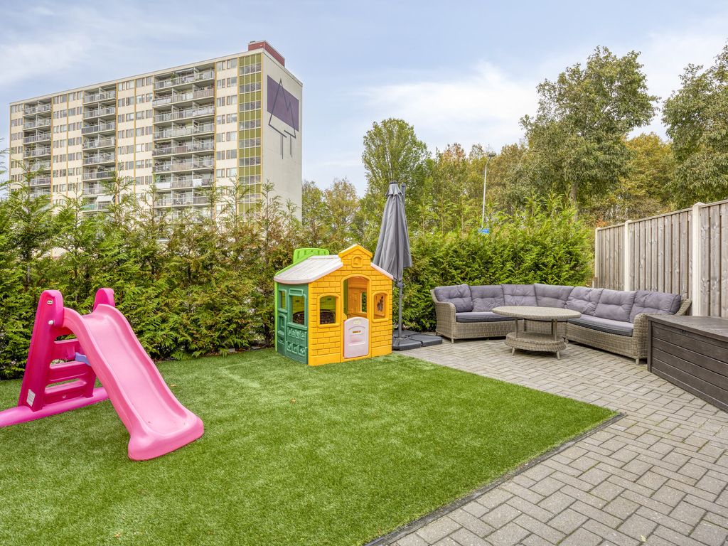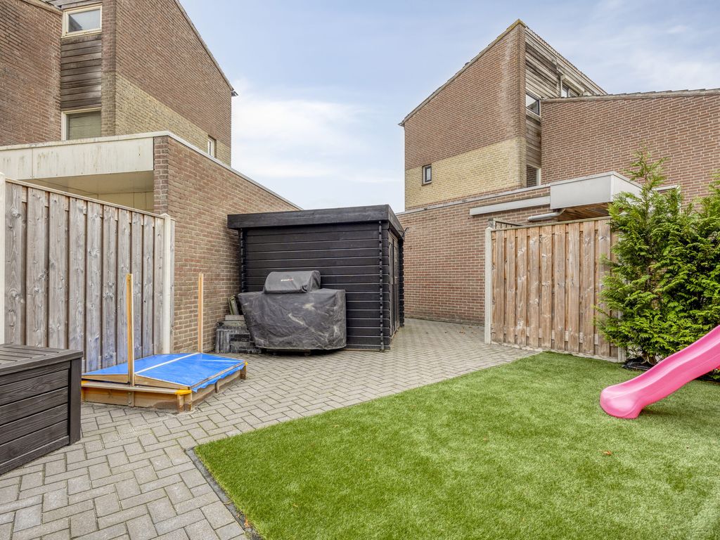 De achtertuin is onderhoudsvriendelijk aangelegd met een groot terras en groen. Aan de zijkant van de woning ligt een tweede tuin met terras en kunstgras, ideaal voor kinderen of om zelf van het buitenleven te genieten. Tevens bent u het gehele jaar verzekerd van een heerlijke plek in de zon en schaduw. Er is een houten berging aanwezig, ideaal voor het opbergen van speelgoed, tuingereedschap e.d. en de achtertuin is bereikbaar via een eigen achterom.
