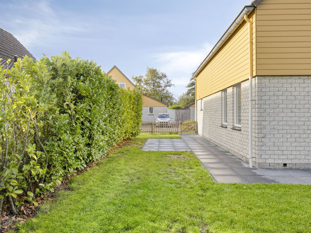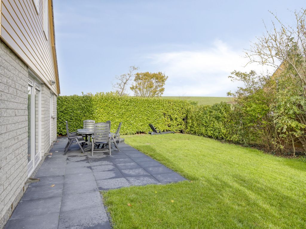 Der Garten rund um das Haus ist weitläufig, vollständig eingezäunt und weitgehend blickdicht von einer Hecke eingerahmt, ideal für Haustiere und Kinder. Hinter dem Haus befindet sich eine Terrasse, auf der Sie das Leben im Freien genießen können, während die Rasenfläche viel Platz zum Spielen und Entspannen bietet. Über den Garten erreichen Sie auch den Abstellraum, in dem die Heizungsanlage (Nefit, 2017) installiert ist.