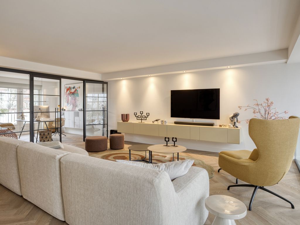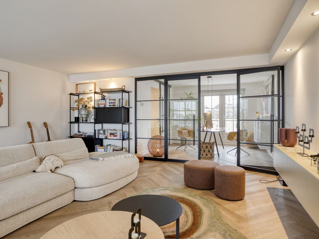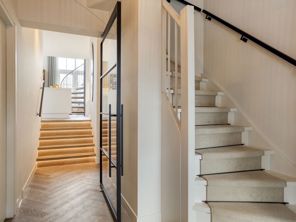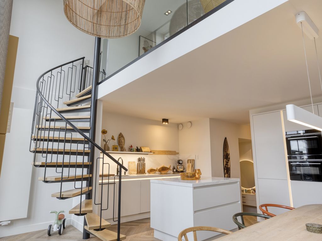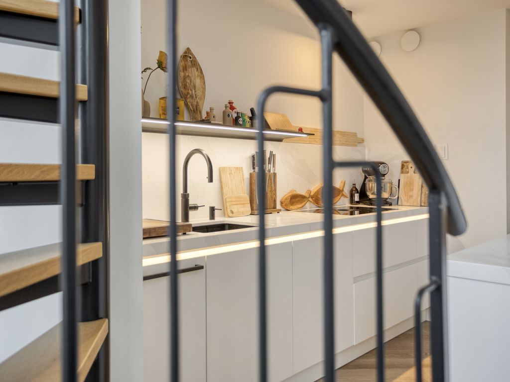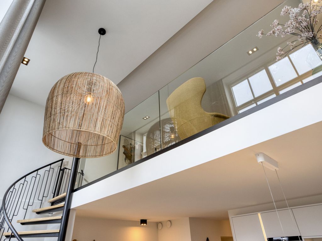 Dankzij de vide en de indrukwekkende raampartijen van circa 5,5 meter hoog valt er uitzonderlijk veel daglicht binnen. Via de openslaande tuindeuren lopen woonkeuken en terras naadloos in elkaar over. Vanuit de woonkeuken geeft een elegante spiltrap direct toegang tot de bovengelegen woonkamer. Het stijlvolle interieur sluit perfect aan bij de architectuur van de woning en kan in overleg worden overgenomen.