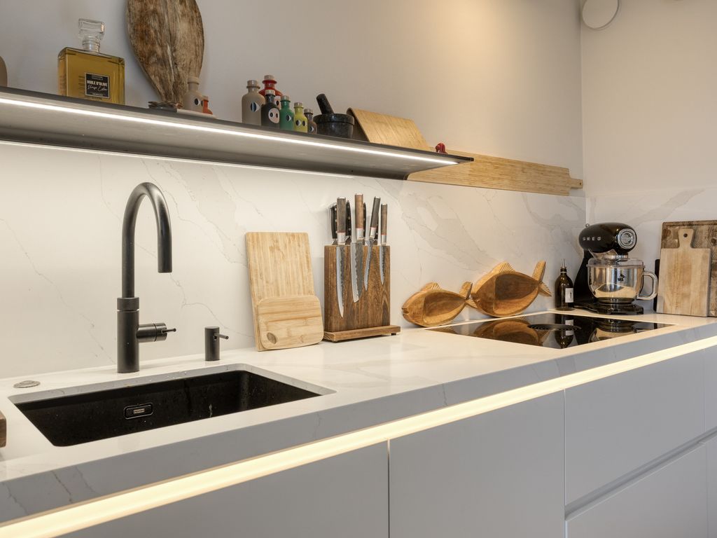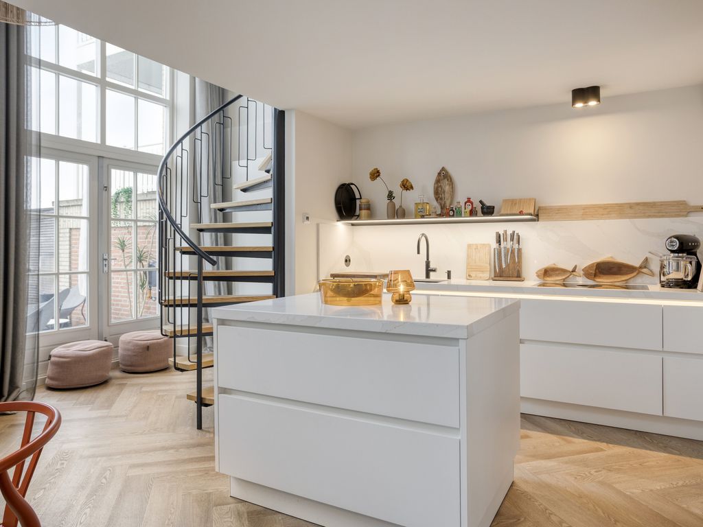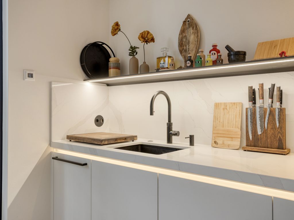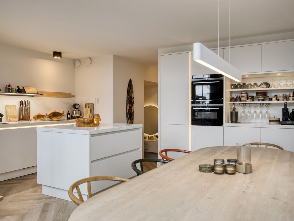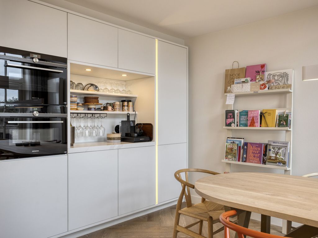 Boven aangekomen betreedt u de indrukwekkende woonkeuken. De nieuwe maatwerkkeuken met werkeiland is hoogwaardig uitgevoerd en uitgerust met alle denkbare luxe, waaronder een inductiekookplaat met bladafzuiging, twee koelkasten, een vriezer, vaatwasser, combi-oven én stoomoven, Quooker, spoelbak met vermaler en een vacumeerset. De keuken is uitgevoerd in een lichte kleurstelling met een wit marmeren werkblad en achterwand en afgewerkt met stijlvolle designverlichting van Jansen & De Bont, subtiele LED-verlichting accentueert de keuken.