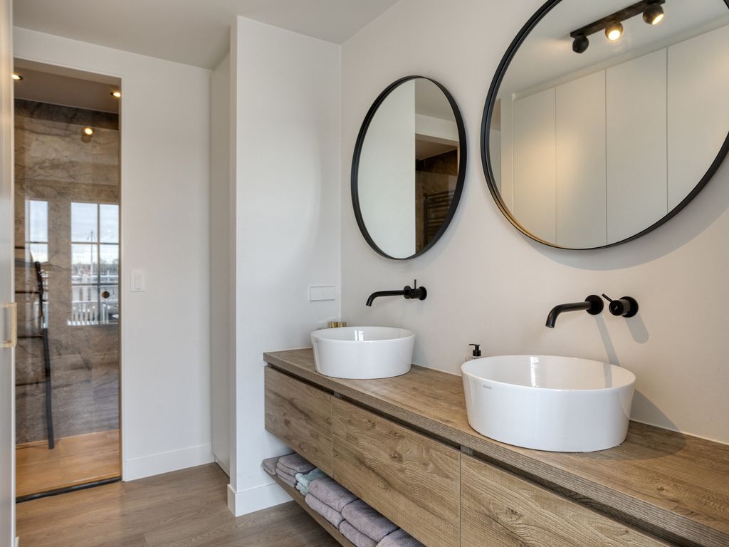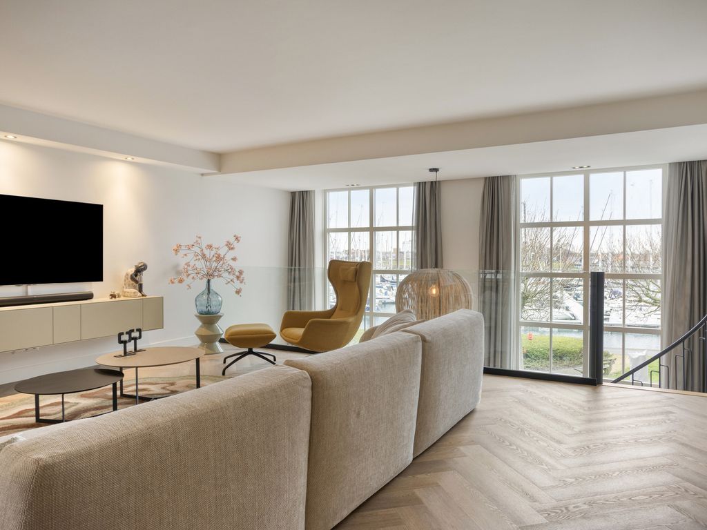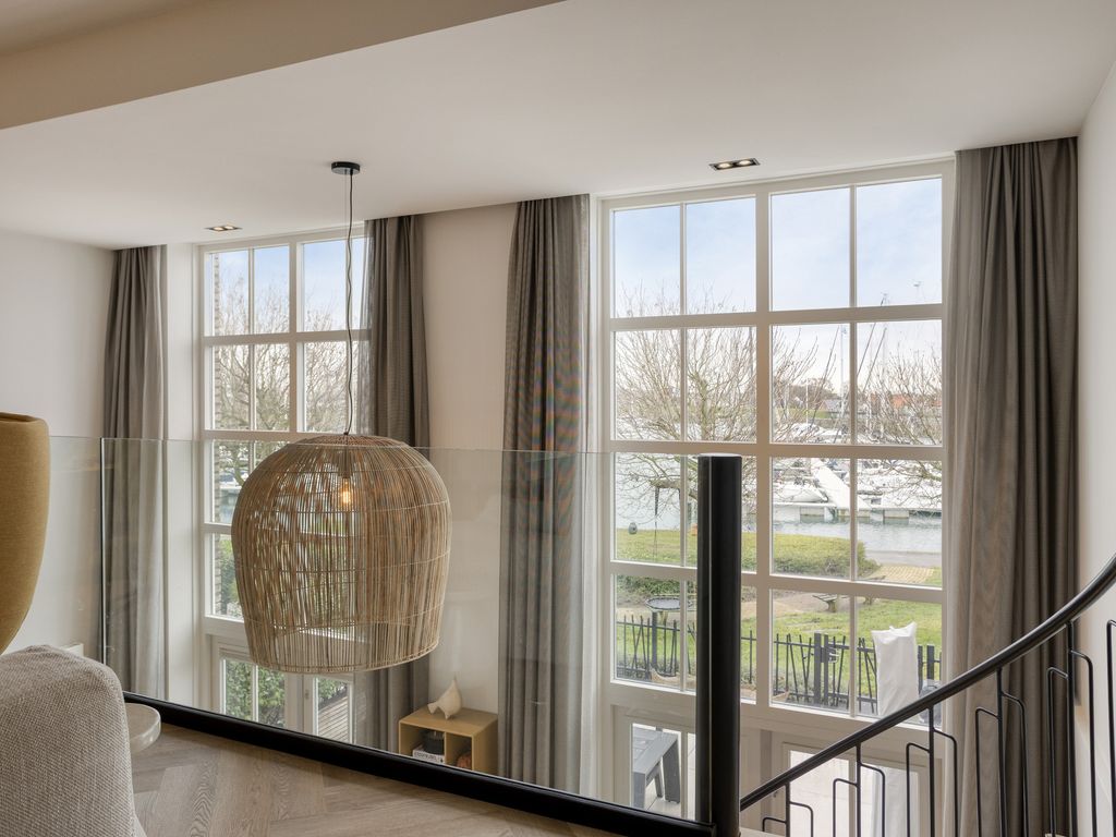De eerste verdieping is op twee manieren bereikbaar: via de vaste trap in de entree en via de spiltrap in de woonkeuken. De trap vanuit de woonkeuken brengt u in de lichte en ruime living. Een glazen balustrade en grote raampartijen zorgen hier voor een prachtig, vrij uitzicht over de vide naar de jachthaven. De woonkamer is royaal van opzet en zeer smaakvol ingericht. Ook op deze verdieping ligt dezelfde visgraatvloer als op de begane grond, wat zorgt voor een mooi geheel.