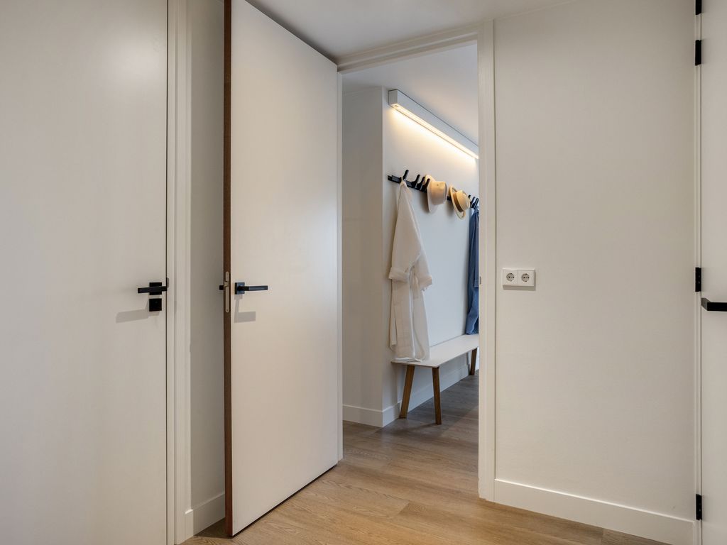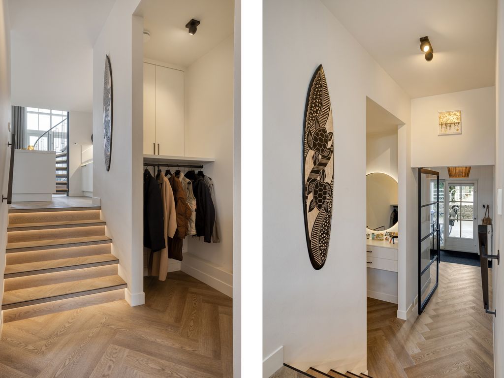 Vanuit de hal krijgt u via een chique taatsdeur al een eerste blik op de woonkeuken. Deze ligt iets hoger en is bereikbaar via een korte trap van vijf treden, subtiel verlicht met LED-traptredeverlichting. Aan de rechterzijde van deze trap bevindt zich een praktische nis met een garderobe, voorzien van voldoende ruimte voor jassen en een meubel aan de wand met spiegel. Achter de garderobe is, netjes uit het zicht, de technische ruimte gesitueerd met daarin de cv-ketel (2022).