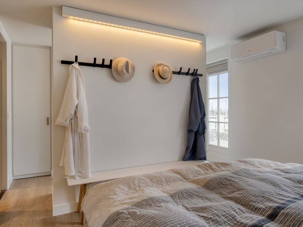 Via de vaste trap bereikt u de ruime overloop van de tweede verdieping. Aan de havenzijde bevindt zich een royale slaapkamer met een fraaie inloopkast, die op stijlvolle wijze is gecombineerd met een badkamer en-suite. In de slaapkamer is een elegant wasmeubel met dubbele waskommen geplaatst en achter een glazen deur bevindt zich de inloopdouche. De slaapkamer is tevens voorzien van airconditioning. Dubbele deuren geven vanuit de slaapkamer toegang tot het ruime dakterras op het zuiden, met een schitterend uitzicht over de haven en het dorp, inclusief de twee karakteristieke molens. Vanaf de overloop heeft u daarnaast toegang tot een separaat toilet met fonteintje en een tweede badkamer, uitgerust met een inloopdouche en wastafelmeubel met waskom. Alle sanitaire ruimtes zijn afgewerkt met hetzelfde tegelwerk, wat zorgt voor een rustige en stijlvolle uitstraling.