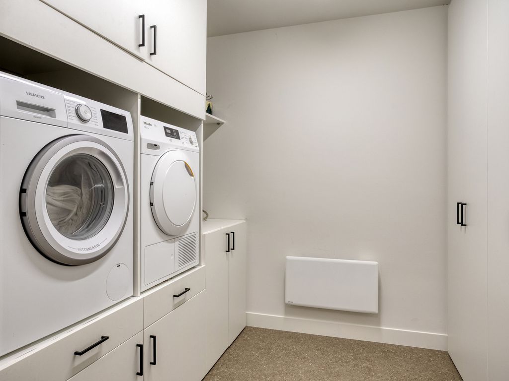 In de ontvangsthal voelt het meteen als luxe thuiskomen. Aan de rechterzijde bevindt zich de uitgebreide meterkast (20 groepen) en hier vind u ook de stijlvolle trap naar de eerste verdieping. Aan de linkerzijde heeft u toegang tot de voormalige garage, die is opgedeeld in twee functionele delen. Het voorste deel is in gebruik als berging en voorzien van een nieuwe elektrische sectionaaldeur. Het achterste deel is omgebouwd tot een luxe waskamer, met wasmachine en droger op hoogte en daaromheen fraai maatwerk kastenwerk.
