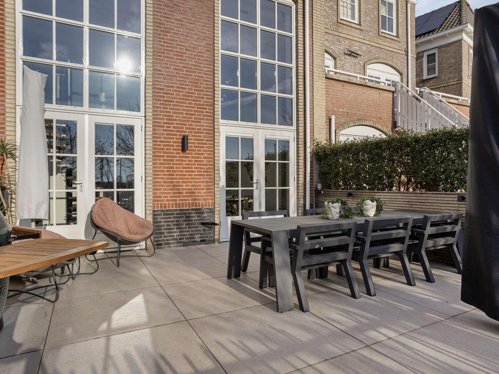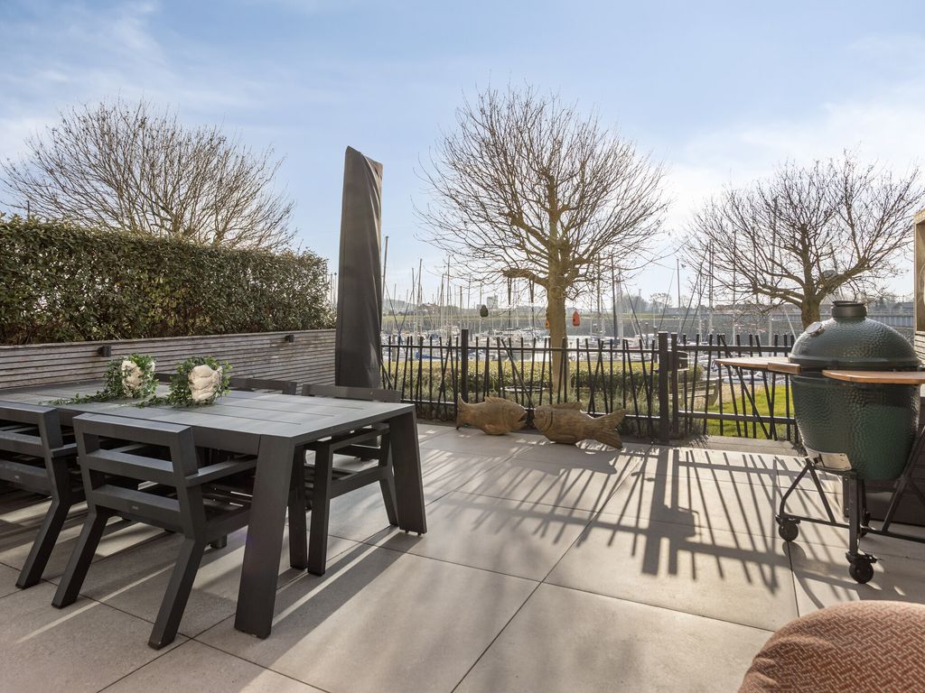 Het nieuw aangelegde terras is bereikbaar vanuit de woonkeuken en uitgevoerd met fraai keramisch tegelwerk en een nieuw hekwerk met directe toegang tot de jachthaven. Het terras is gelegen op het zuiden en biedt uitzicht over de jachthaven: een heerlijke plek voor lange zomeravonden, een borrel met vrienden of een ontspannen ontbijt in het weekend. Daarnaast beschikt de woning over twee ruime dakterrassen, bereikbaar vanuit het kantoor op de eerste verdieping en vanuit de slaapkamer op de tweede verdieping, waardoor u op elk moment van de dag van zon en uitzicht kunt genieten.