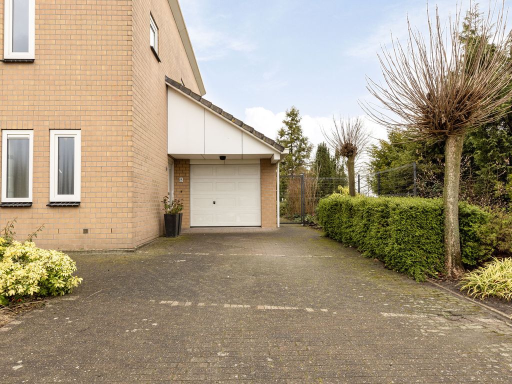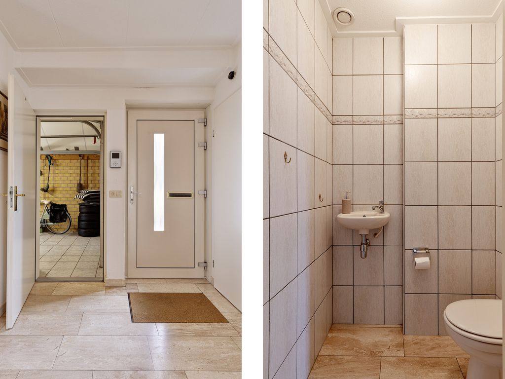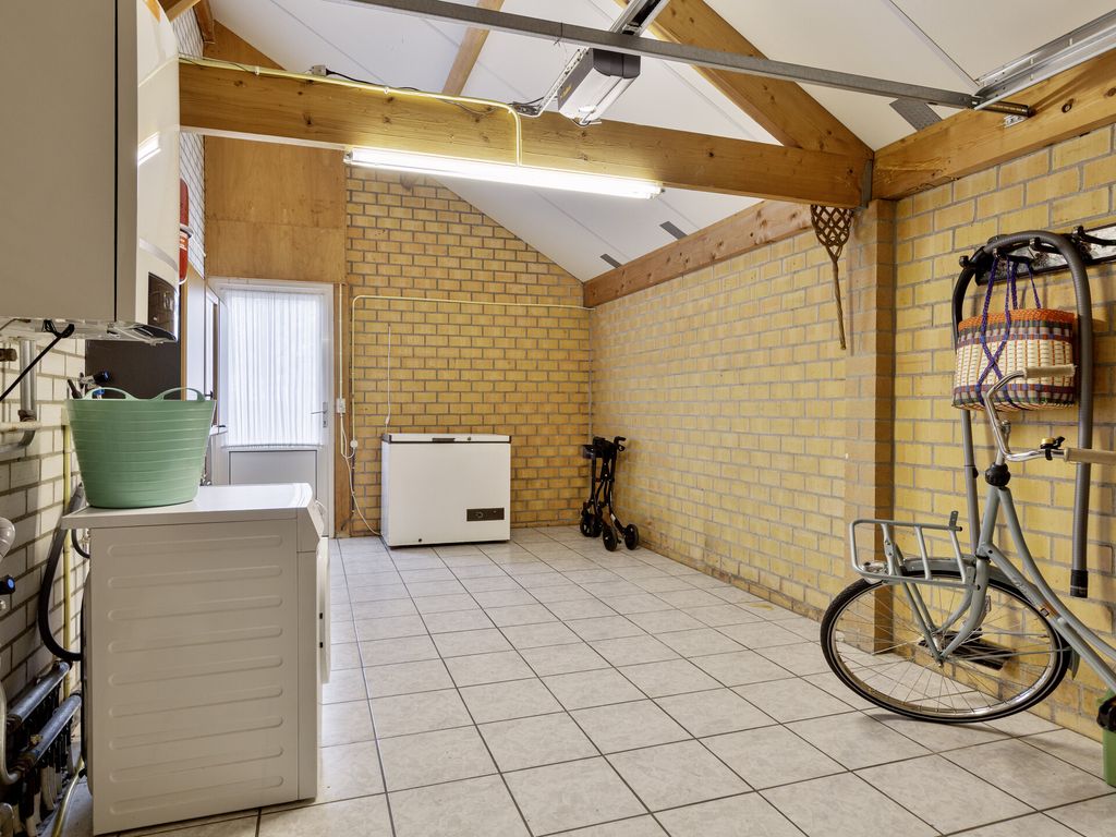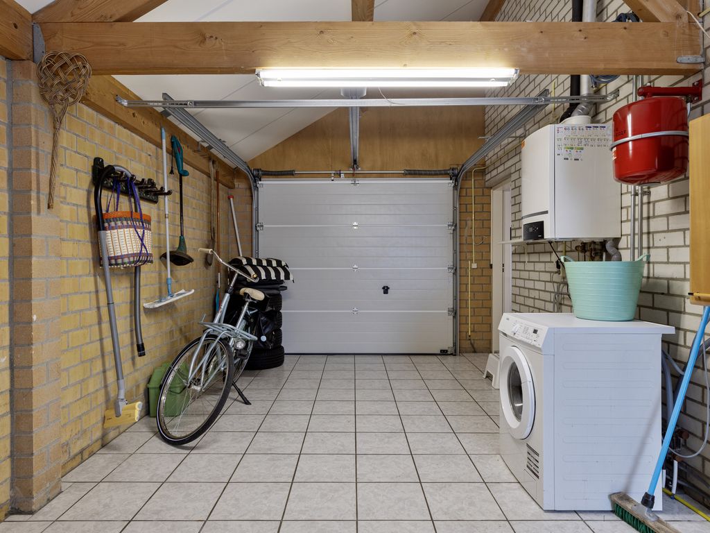 De inpandige garage is bereikbaar vanuit de hal en voorzien van een tegelvloer en open nok. Hier bevinden zich tevens de cv-opstelling en de witgoedaansluitingen. Aan de voorzijde is de garage uitgerust met een geïsoleerde elektrische sectionaaldeur, terwijl een loopdeur aan de achterzijde toegang geeft tot de tuin.