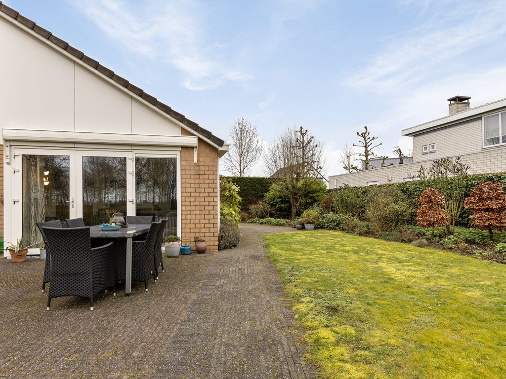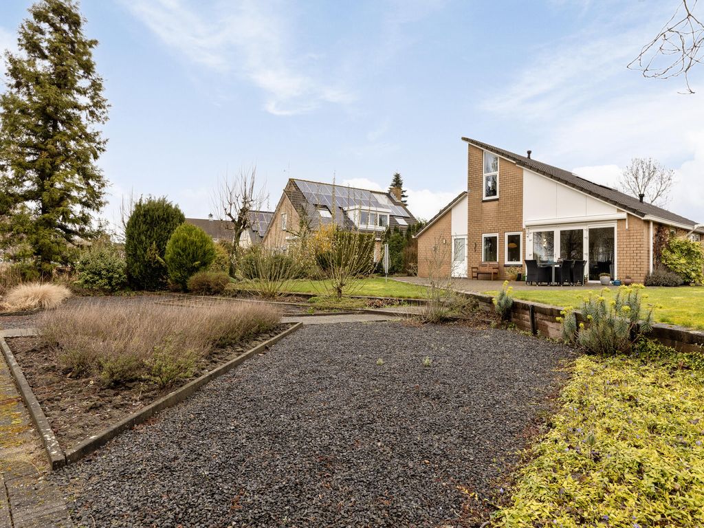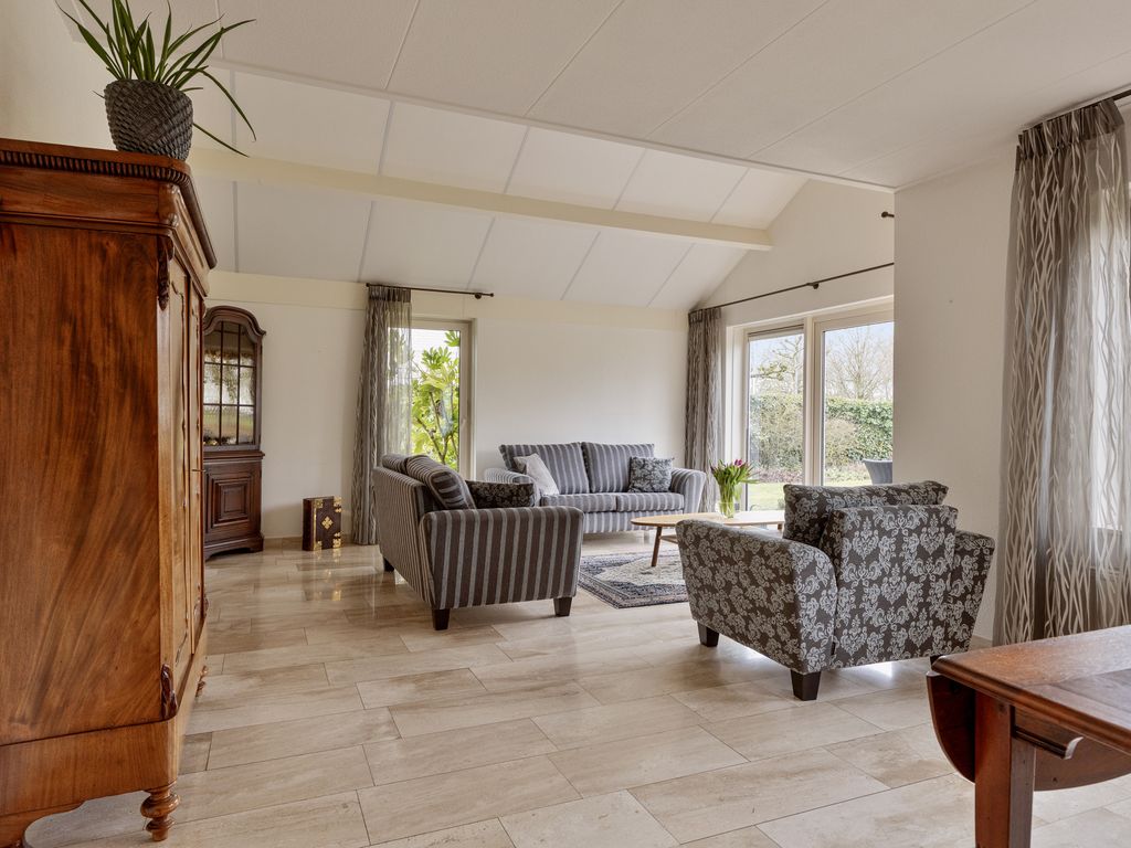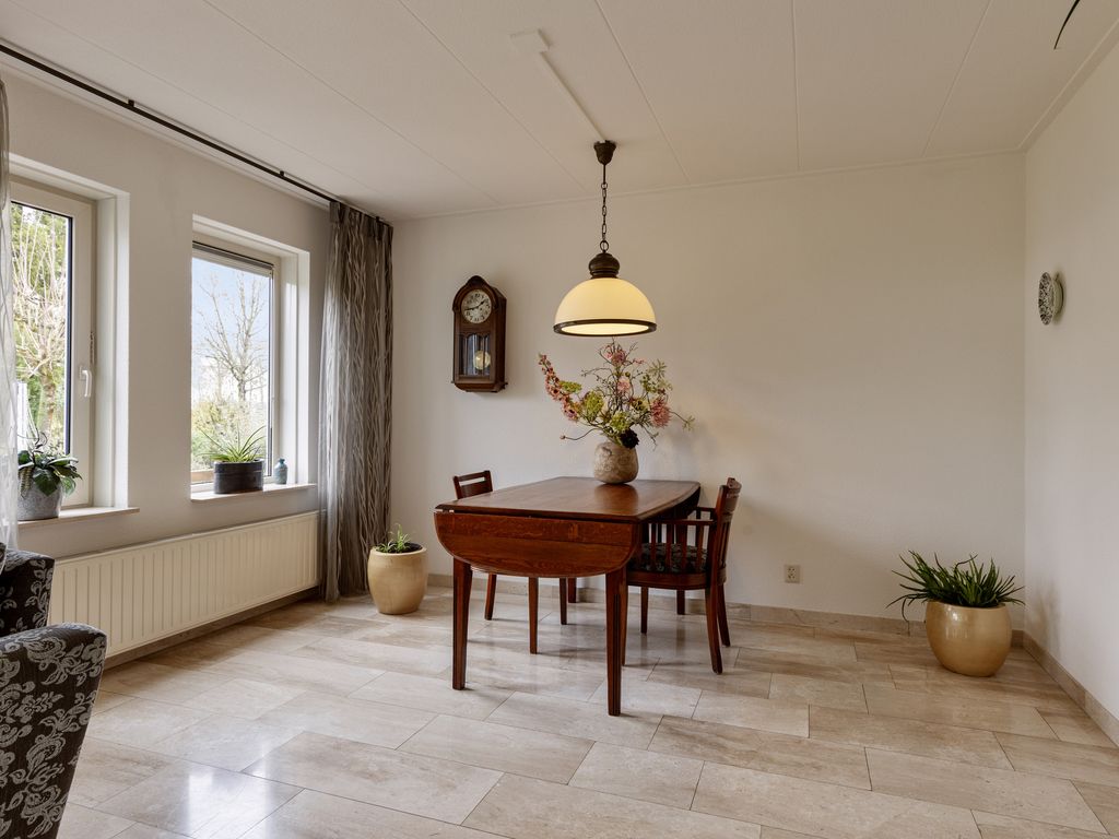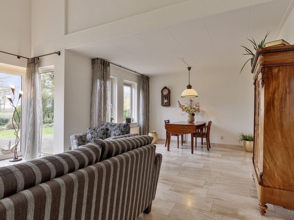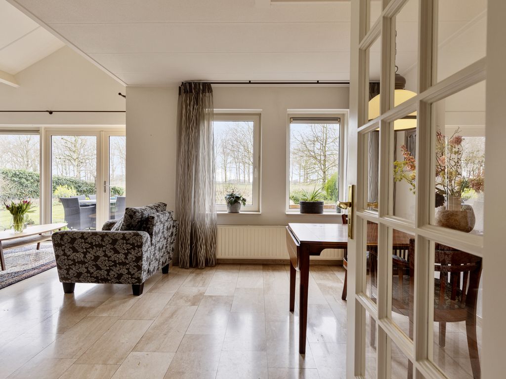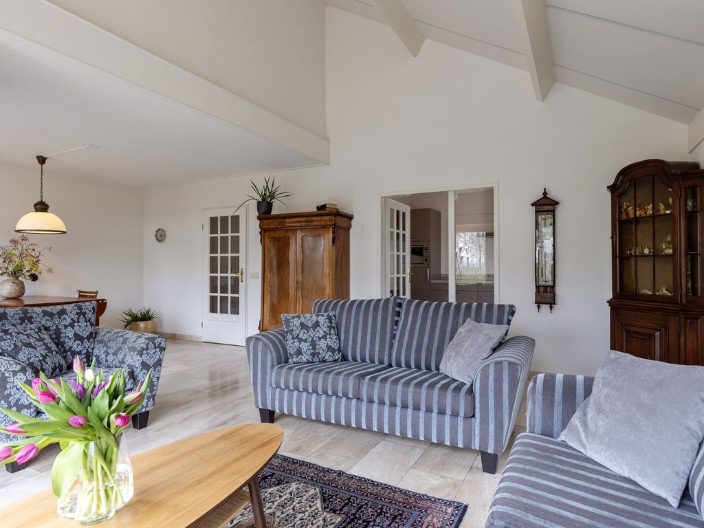 De woonkamer ligt aan de achterzijde en is speels vormgegeven met een open nok, wat zorgt voor extra hoogte en licht. Grote raampartijen en openslaande tuindeuren verbinden binnen moeiteloos met buiten en bieden een fraai uitzicht over de tuin en het achtergelegen water. Er is volop ruimte voor zowel een royale zithoek als een eethoek.