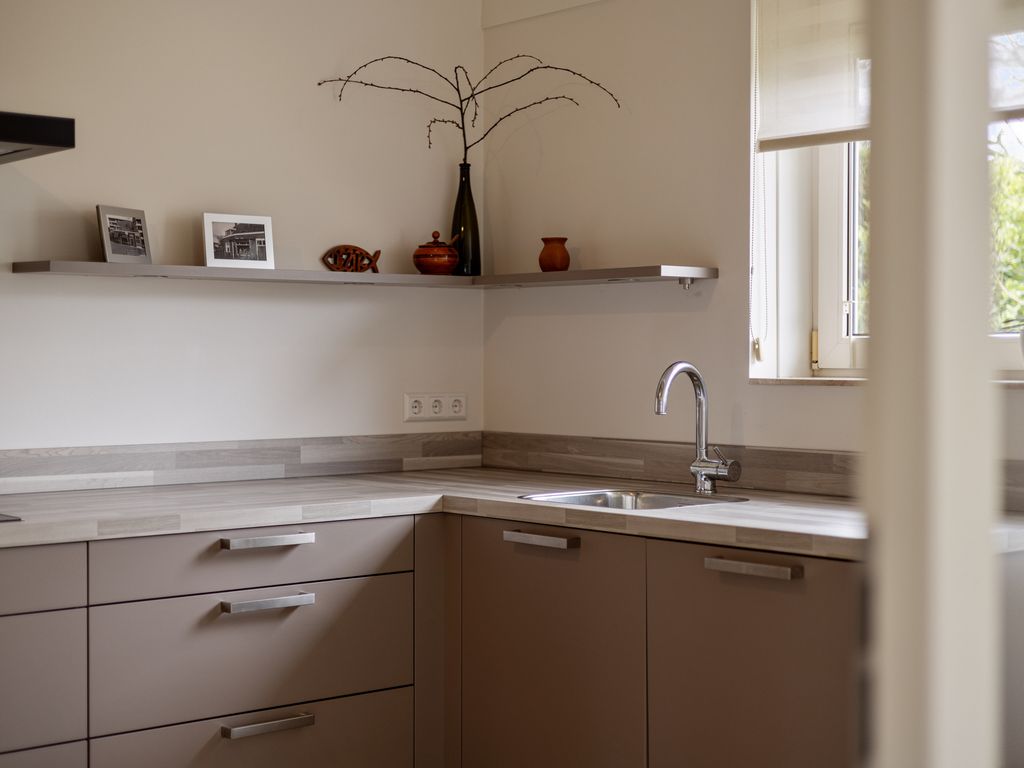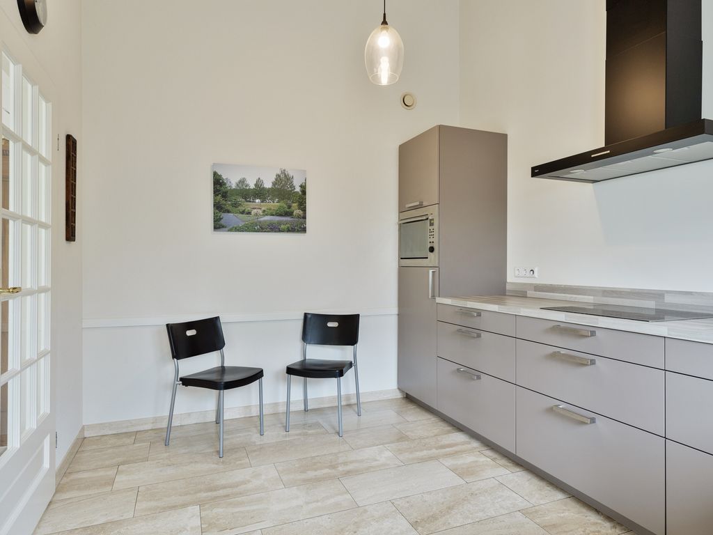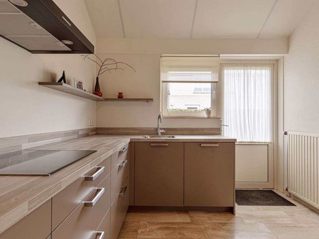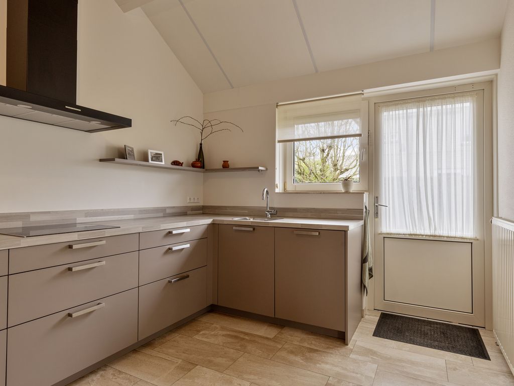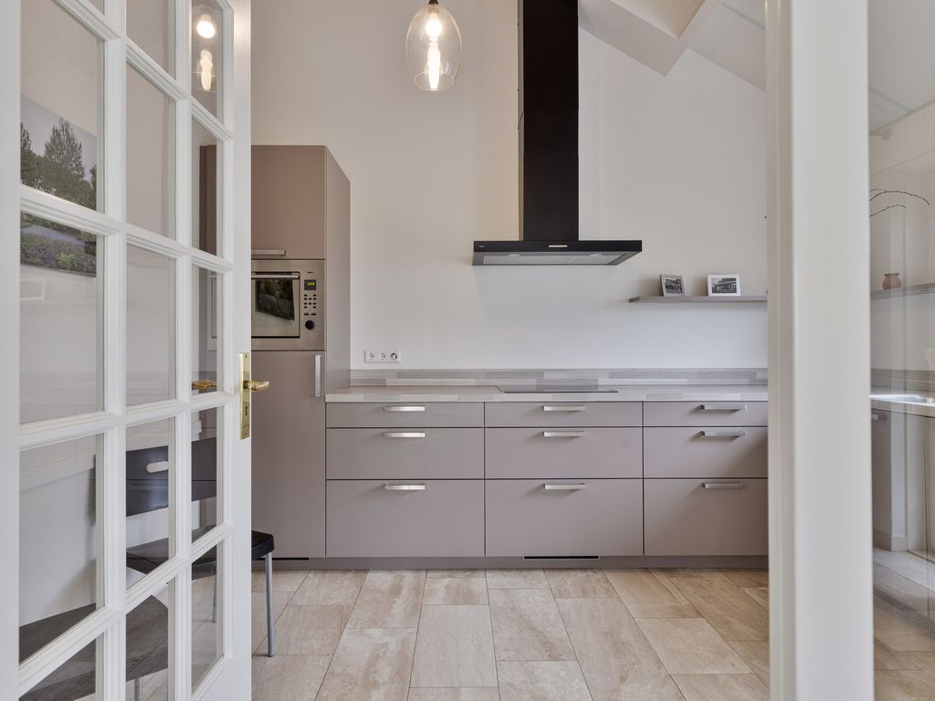 Aansluitend bevindt zich de keuken in L-opstelling, uitgevoerd met moderne fronten en een bijpassend werkblad. De keuken is voorzien van diverse inbouwapparatuur, waaronder een inductiekookplaat, afzuigkap, vaatwasser, koelkast met vriesvak en een combi-oven. De hal, woonkamer en keuken zijn afgewerkt met een natuurstenen vloer (travertin).