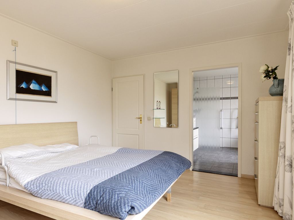 De slaapkamer op de begane grond is ruim opgezet en beschikt over grote raampartijen. Aangrenzend ligt de badkamer en suite, ingericht met een inloopdouche, toilet en wastafel met meubel.