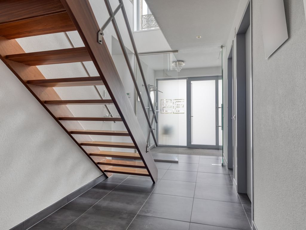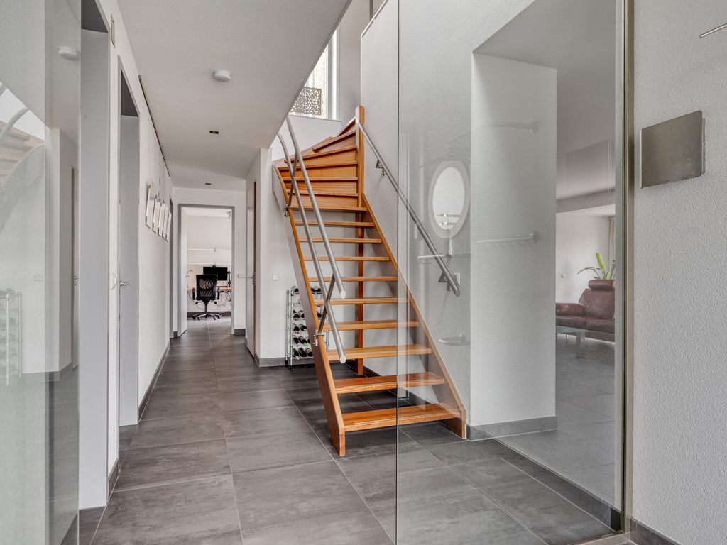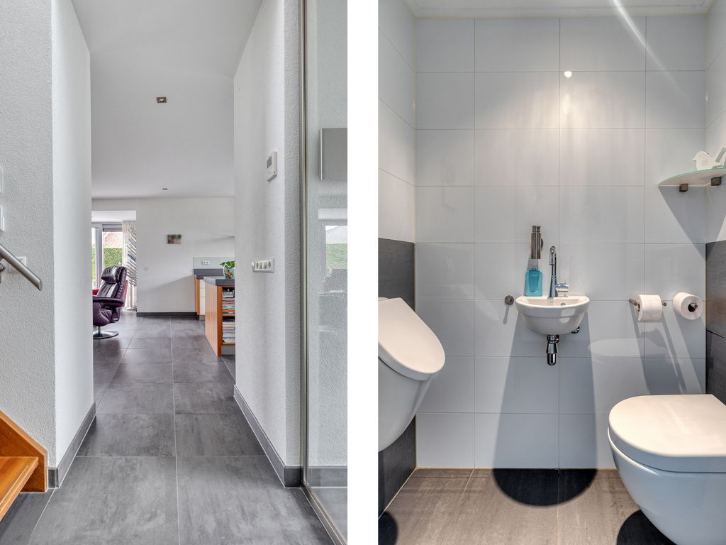 Via de brede voortuin, smaakvol aangelegd met siergrassen en struiken, bereikt u de woning. Het garagepad en het aansluitende looppad leiden naar de voordeur, uitgevoerd in aluminium met matglas. Een degelijke entree die toegang biedt tot een ruime ontvangsthal met glazen deuren. Hier is voldoende plek voor een garderobe en bevindt zich tevens de meterkast (12 groepen). De hal leidt naar alle vertrekken op de begane grond: woonkamer met open keuken, slaapkamer met badkamer, kantoorruimte, toilet, garage en bijkeuken. De vaste trap geeft toegang tot de verdieping. Dankzij de vide boven de trap valt er prettig daglicht de woning binnen.