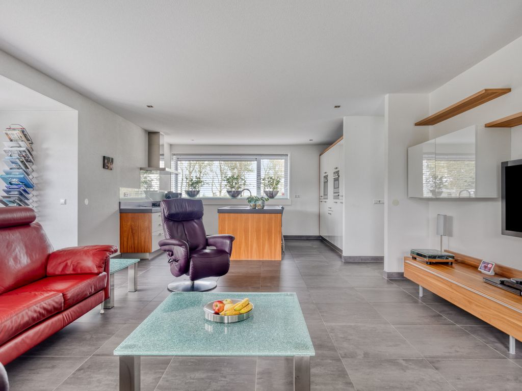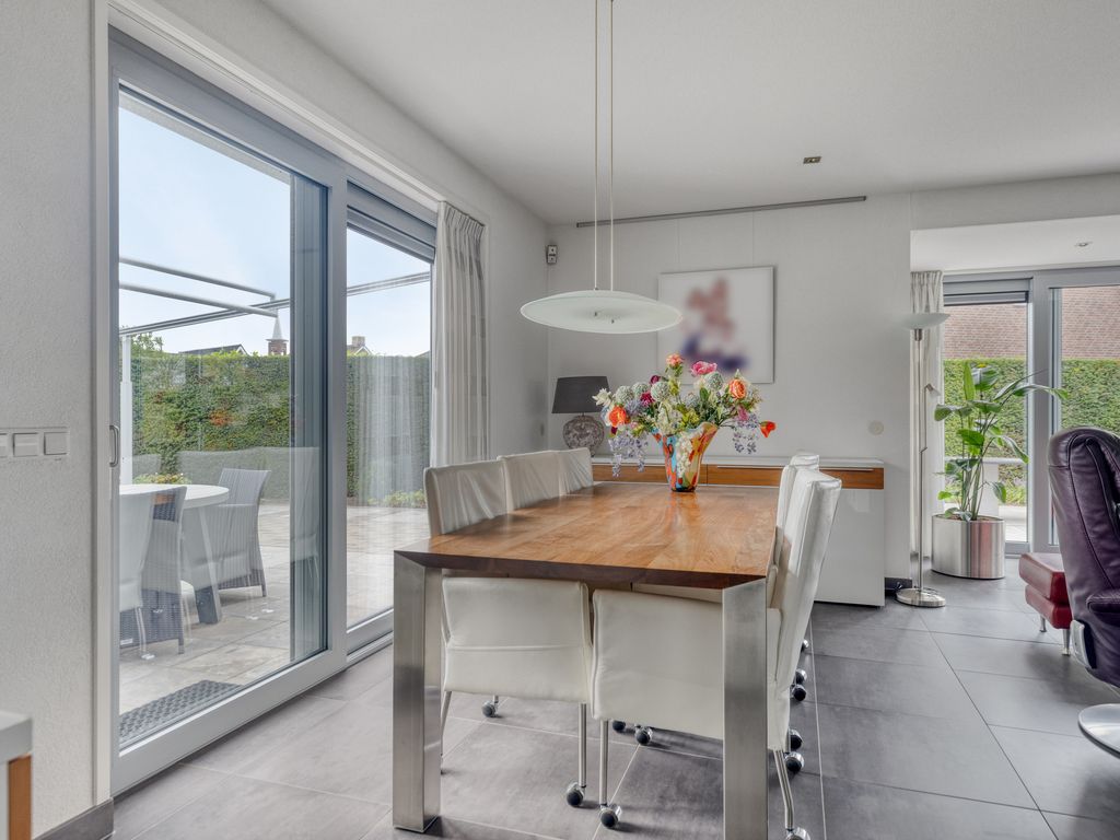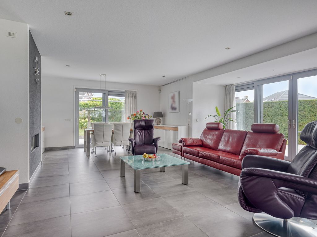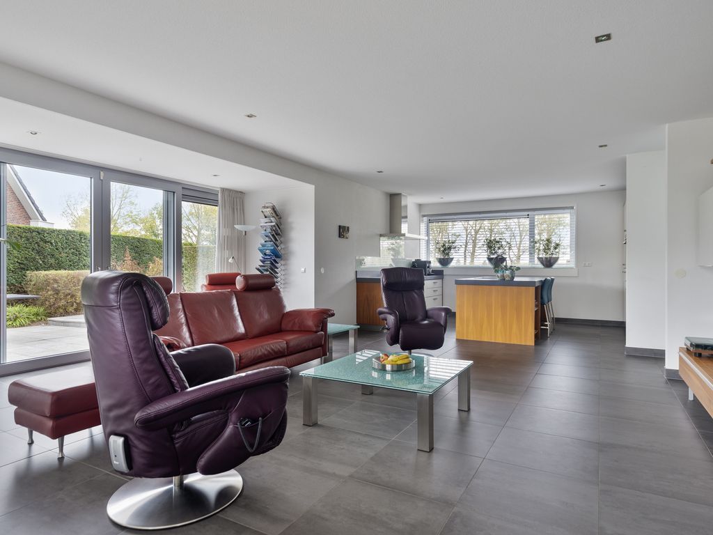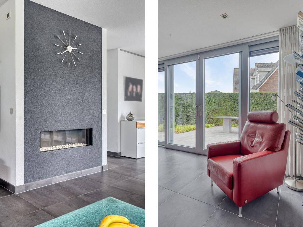 De woonkamer met open keuken is ruim en licht, mede dankzij de schuifpuien aan de achter- en zijkant die zorgen voor veel daglicht en een directe verbinding met de tuin. Centraal is volop ruimte voor een royale zithoek, met een gezellige nis voor de TV en een fraaie gashaard. Aan de achterzijde bevindt zich de eethoek, maar de indeling is flexibel.