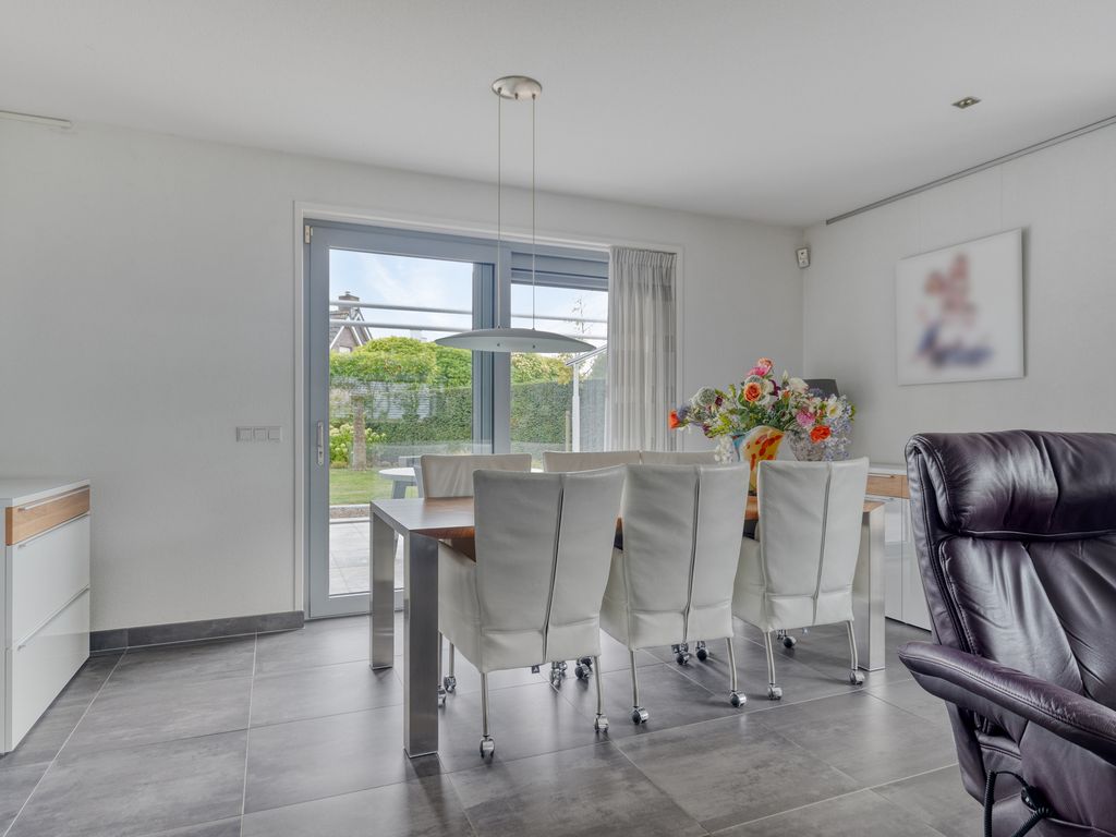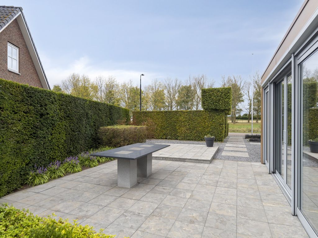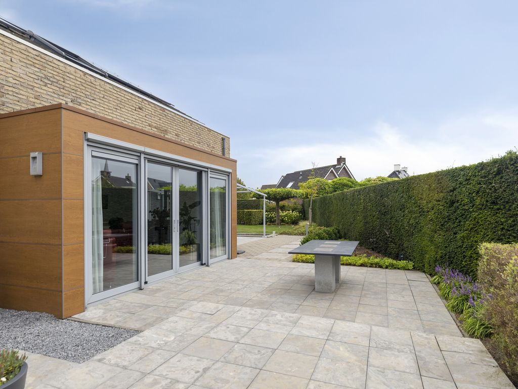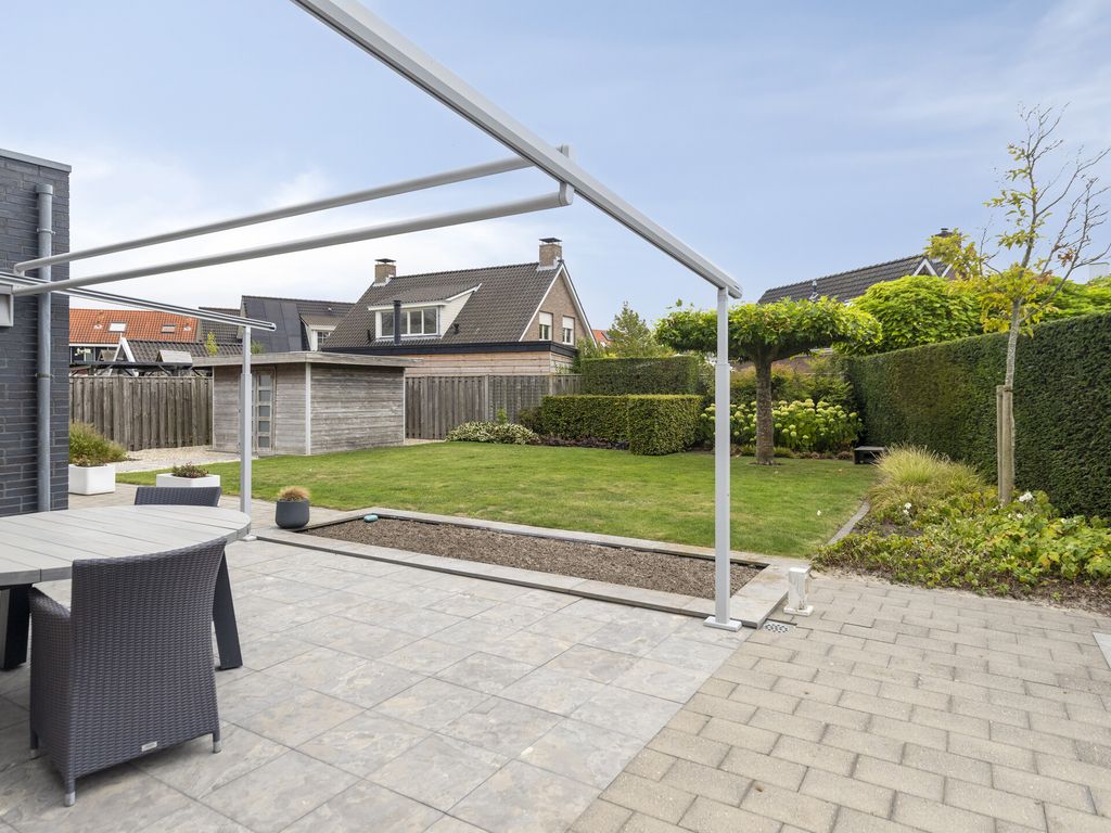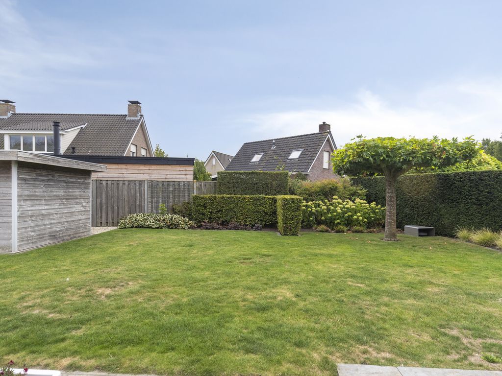 De rondom gelegen tuin is gevarieerd en verzorgd aangelegd en wordt onderhouden door een hovenier. Direct naast en achter de woning bevinden zich ruime terrassen. Het achterterras beschikt over een groot, elektrisch bedienbaar zonnescherm met geïntegreerde LED-verlichting. De ramen van de woonkamer zijn voorzien van screens. Verder bestaat de achtertuin uit een gazon, diverse struiken en bomen en een houten berging. Netjes weggewerkt in de tuin staat ook de unit van de hybride warmtepomp (Altherma, 2022).