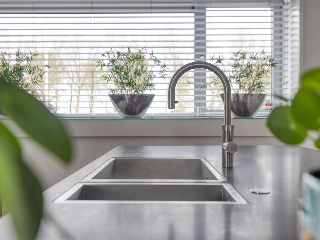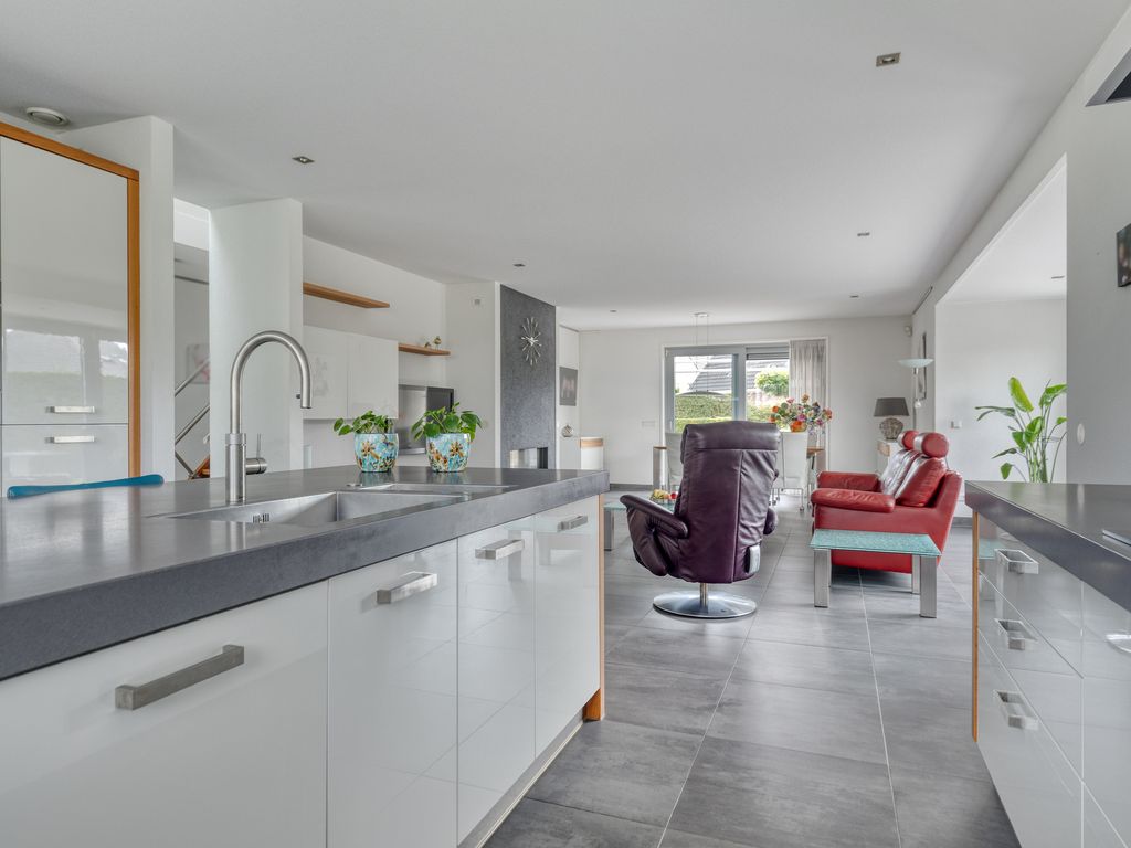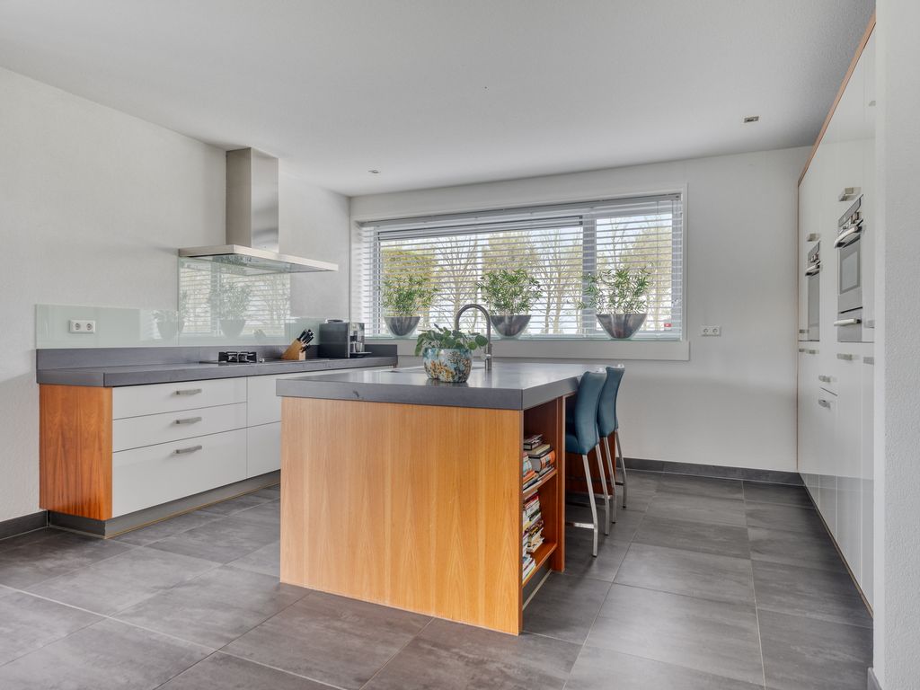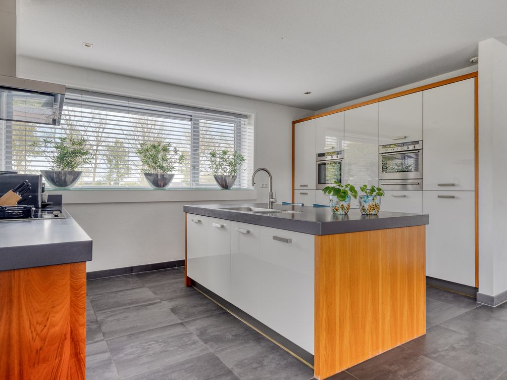 De luxe keuken aan de voorzijde is in lichte kleurstelling uitgevoerd en bestaat uit drie delen: een ruim spoeleiland met spoelbak en Quooker (kokend, gekoeld en bruisend water), een breed aanrechtblad met inductiekookplaat en geïntegreerde wokbrander met afzuigkap, en een hoge kastenwand met bordenwarmer, oven en oven/magnetron. Verder is de keuken ook voorzien van diverse apparatuur zoals koelkast met kelderwagen, compacte vriezer en een vaatwasser.