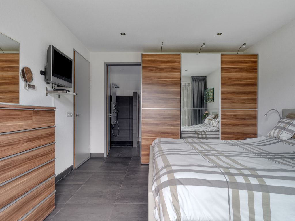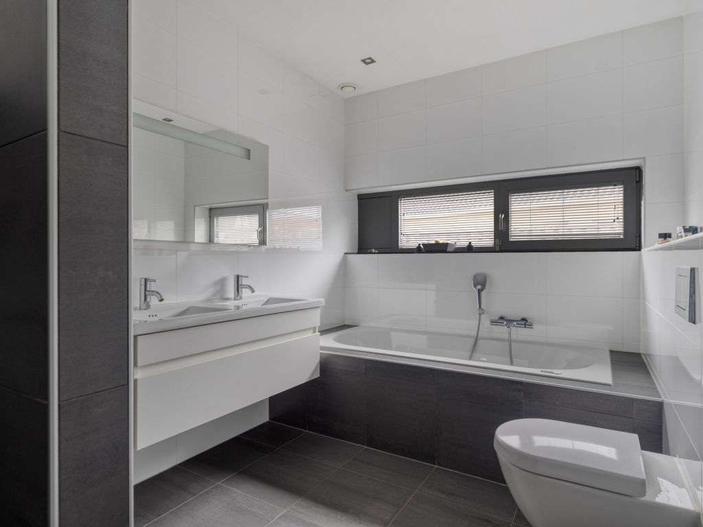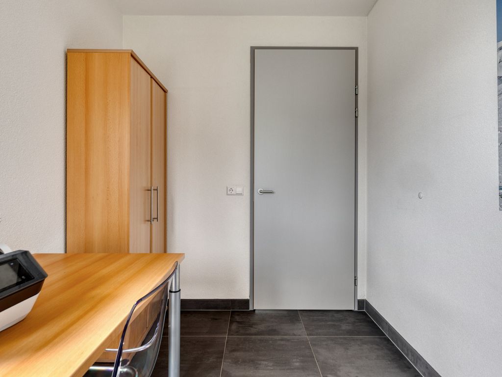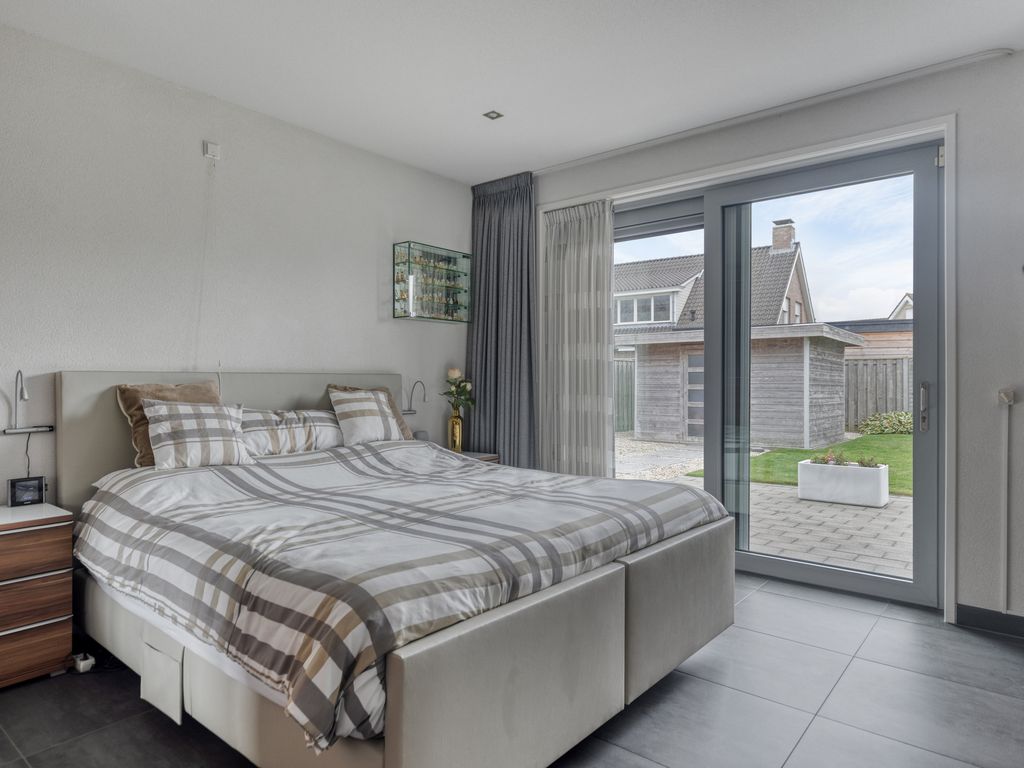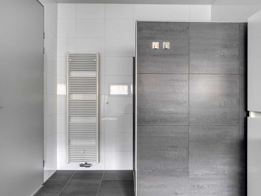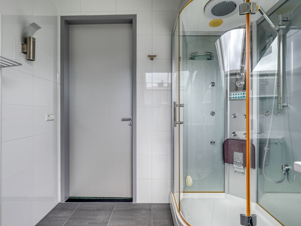 Achterin de hal treft u de slaapkamer met badkamer en suite. De slaapkamer is ruim opgezet en beschikt over een grote schuifpui die ook hier zorgt voor veel lichtinval en direct contact met de tuin. De badkamer is luxe afgewerkt met ligbad, dubbele wastafel, extra toilet, designradiator en een inloopdouche met douchekolom voorzien van regendouche, handdouche en massagejets. Een extra kamer op de begane grond wordt nu gebruikt als kantoor, maar is ook uitstekend geschikt als extra slaapkamer of speelkamer. De gehele begane grond is voorzien van vloerverwarming en volledig ingericht met oog voor toegankelijkheid, onder andere door brede doorgangen en het ontbreken van drempels.