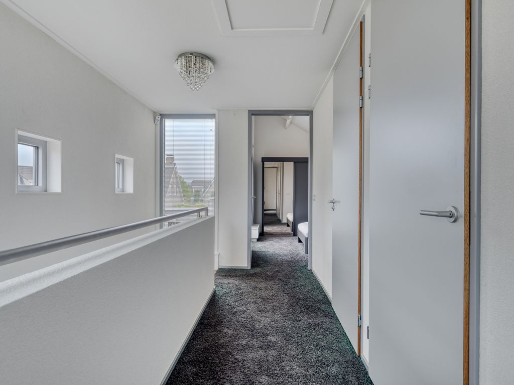 De vaste trap leidt naar een lichte overloop met toegang tot twee slaapkamers, een badkamer en een ruime berging. Hier bevinden zich ook de cv-installatie (Intergas 2022)en de module van de zonnepanelen (18x365Wp, 2021).