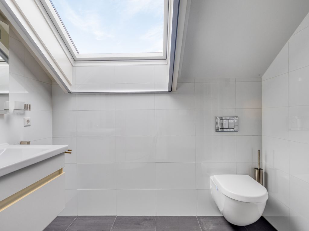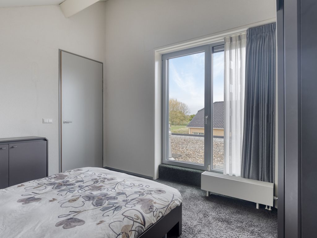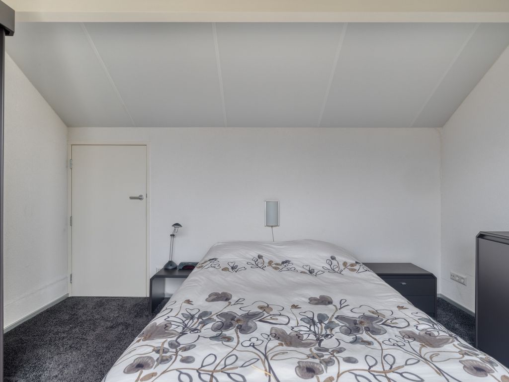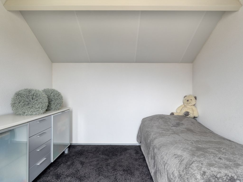De slaapkamer aan de voorzijde is royaal, terwijl de slaapkamer aan de achterzijde nog ruimer is en beschikt over een grote inbouwkast. Beide kamers zijn voorzien van grote raampartijen die tevens toegang geven tot het platte dak. De badkamer is uitgevoerd in lichte kleurstelling en uitgerust met een wastafel, toilet, designradiator en luxe stoomcabine met regendouche, handdouche en massagejets. Vanaf de overloop is middels een luik de bergzolder bereikbaar. Tijdens de bouw is rekening gehouden met een mogelijke opbouw boven de garage, die hiervoor al is onderheid.