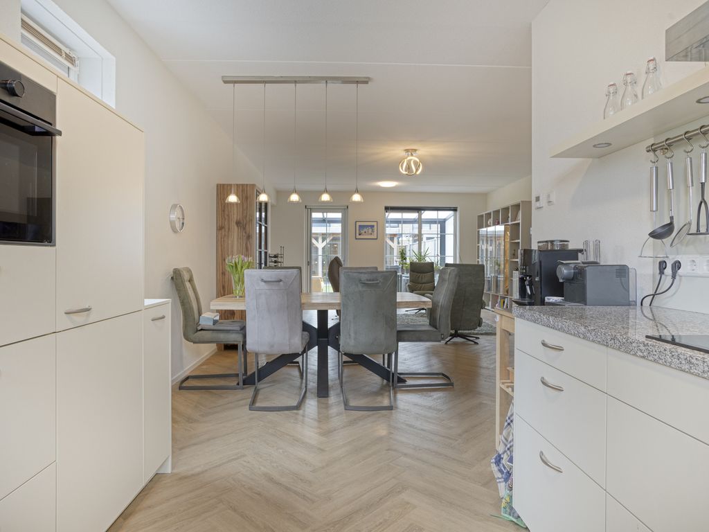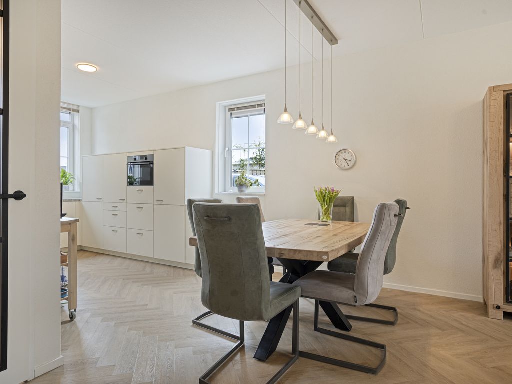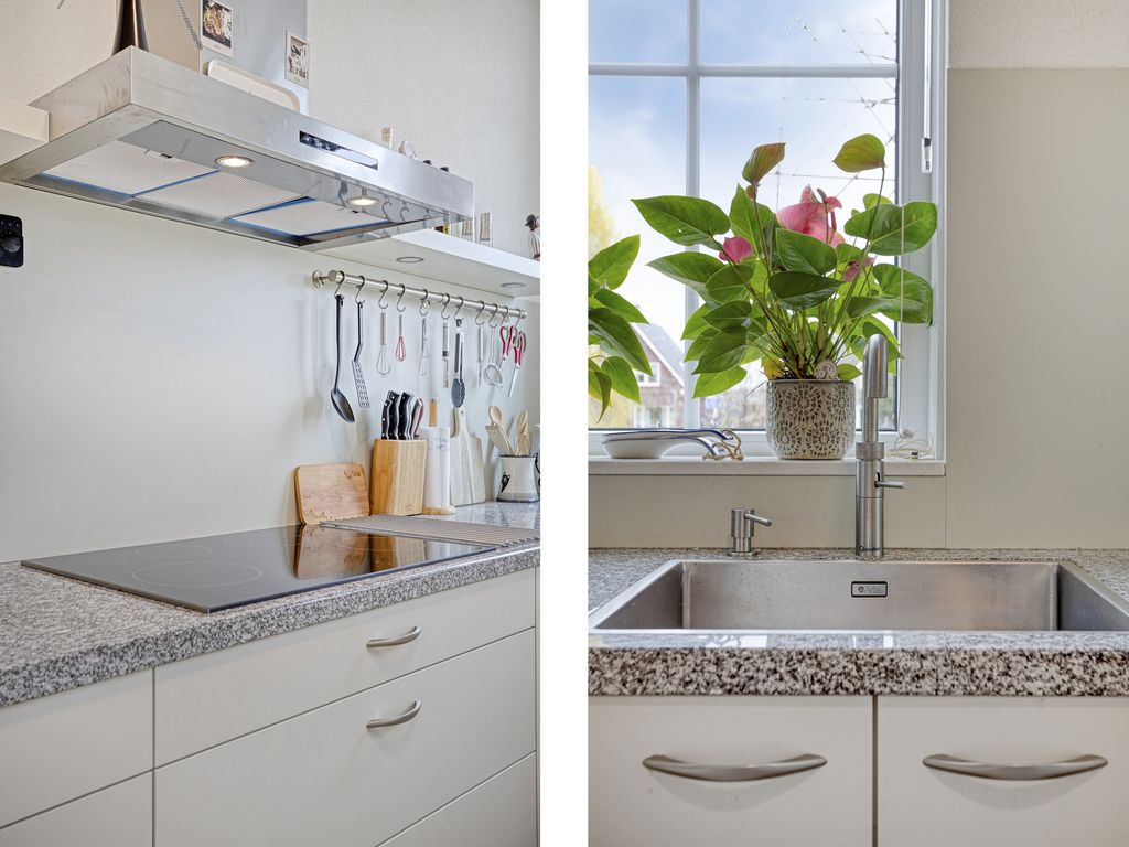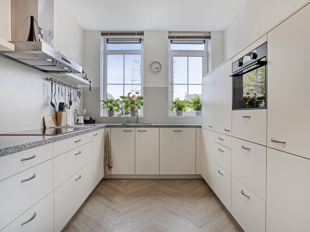 Aan de voorzijde bevindt zich de open keuken in een moderne, lichte opstelling. Deze is voorzien van een inductiekookplaat met afzuigkap, Quooker, vaatwasser, koelkast, vriezer en combi-oven. De raampartijen zorgen voor prettig zicht op de straat en veel daglicht.