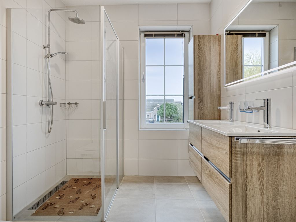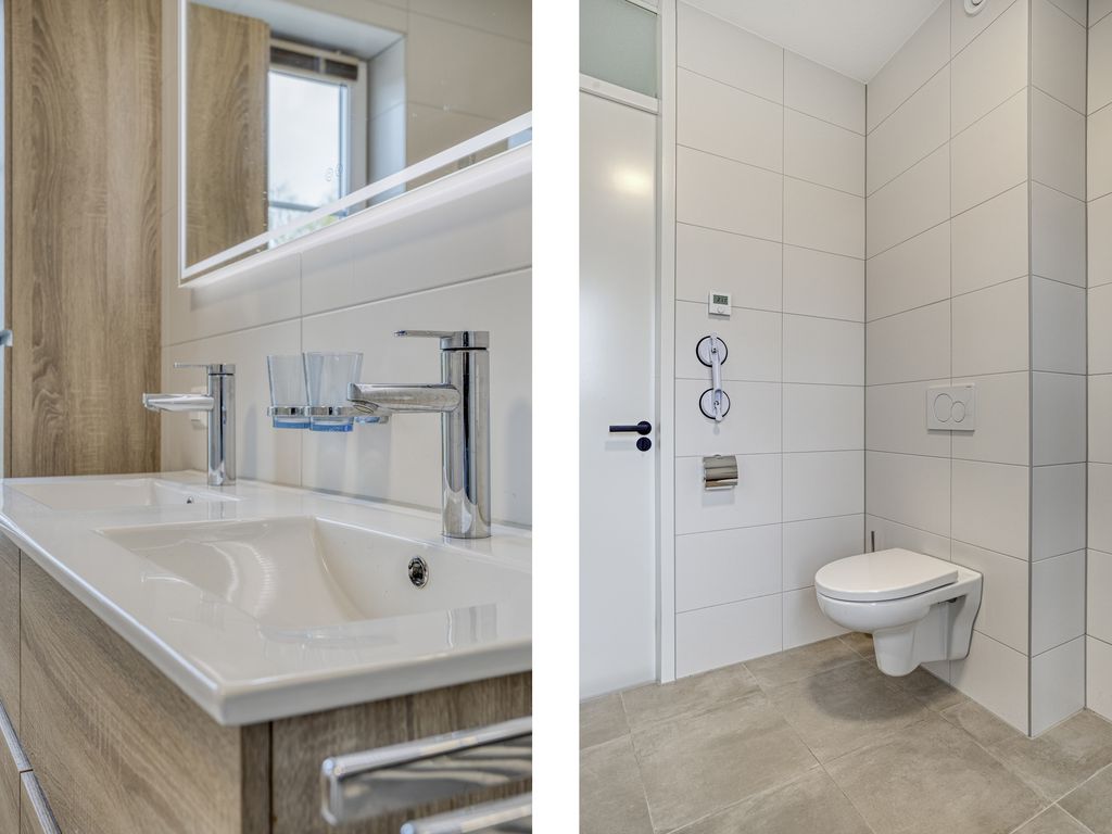 De moderne badkamer ligt eveneens aan de voorzijde en is uitgerust met een inloopdouche, dubbele wastafel met meubel en een toilet. Aan de achterzijde bevinden zich nog twee goed bemeten slaapkamers.
