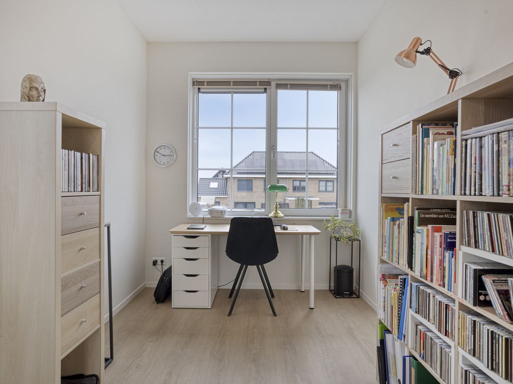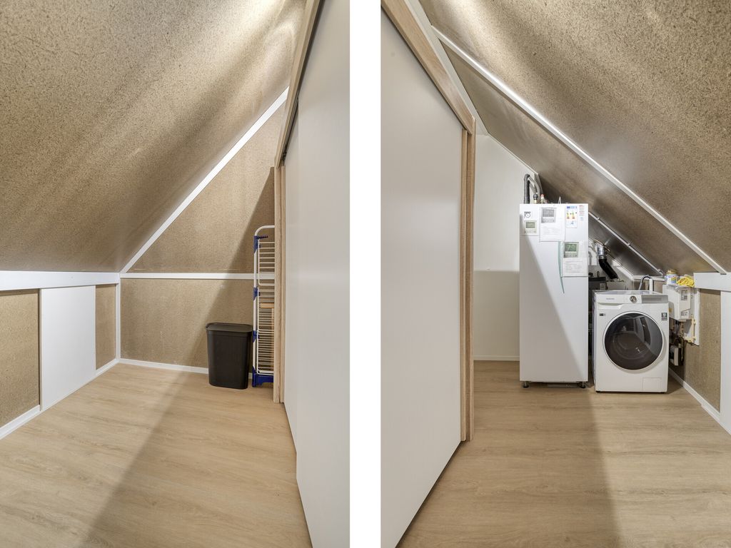 Via een vaste trap is de tweede verdieping bereikbaar. Hier bevindt zich een ruime vierde slaapkamer met dakkapel, dakraam en praktische bergruimte. Aan de voorzijde is een separate berging met de witgoedaansluitingen, de warmtepomp, boiler en de omvormer van de zonnepanelen.