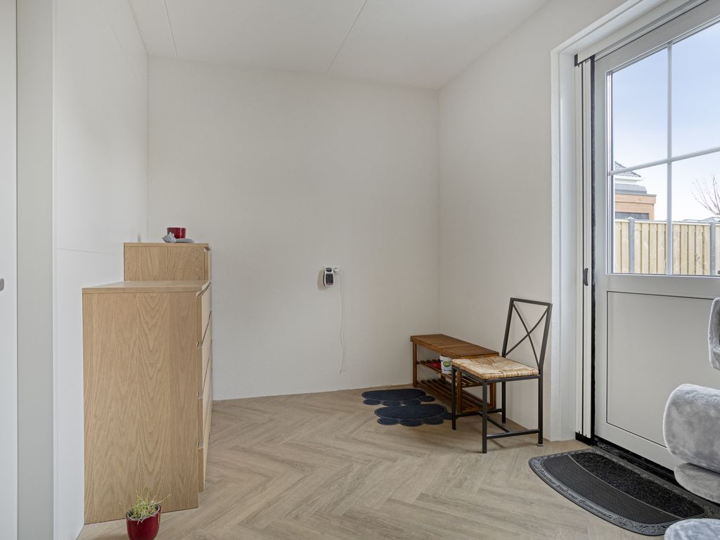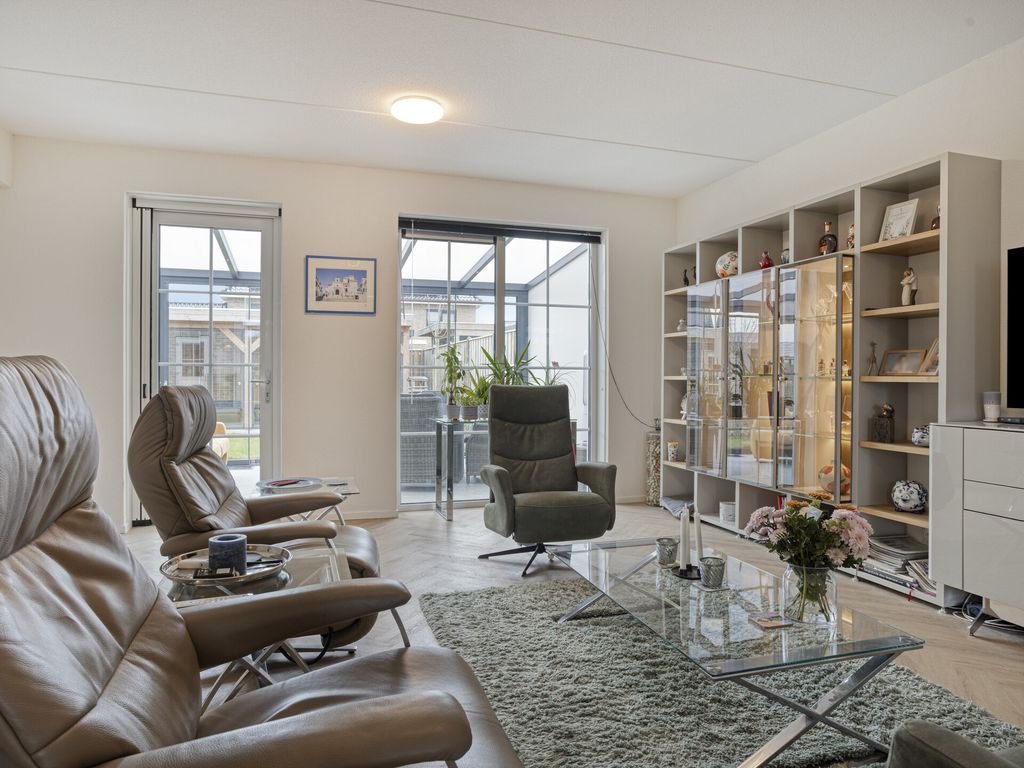 De woonkamer ligt aan de achterzijde en is ruim opgezet, met grote raampartijen en een fijne lichtinval. Onder de trap bevindt zich een praktische trapkast. Aansluitend is de luxe serre gerealiseerd, die de leefruimte op een natuurlijke manier vergroot en een directe verbinding vormt met de tuin.