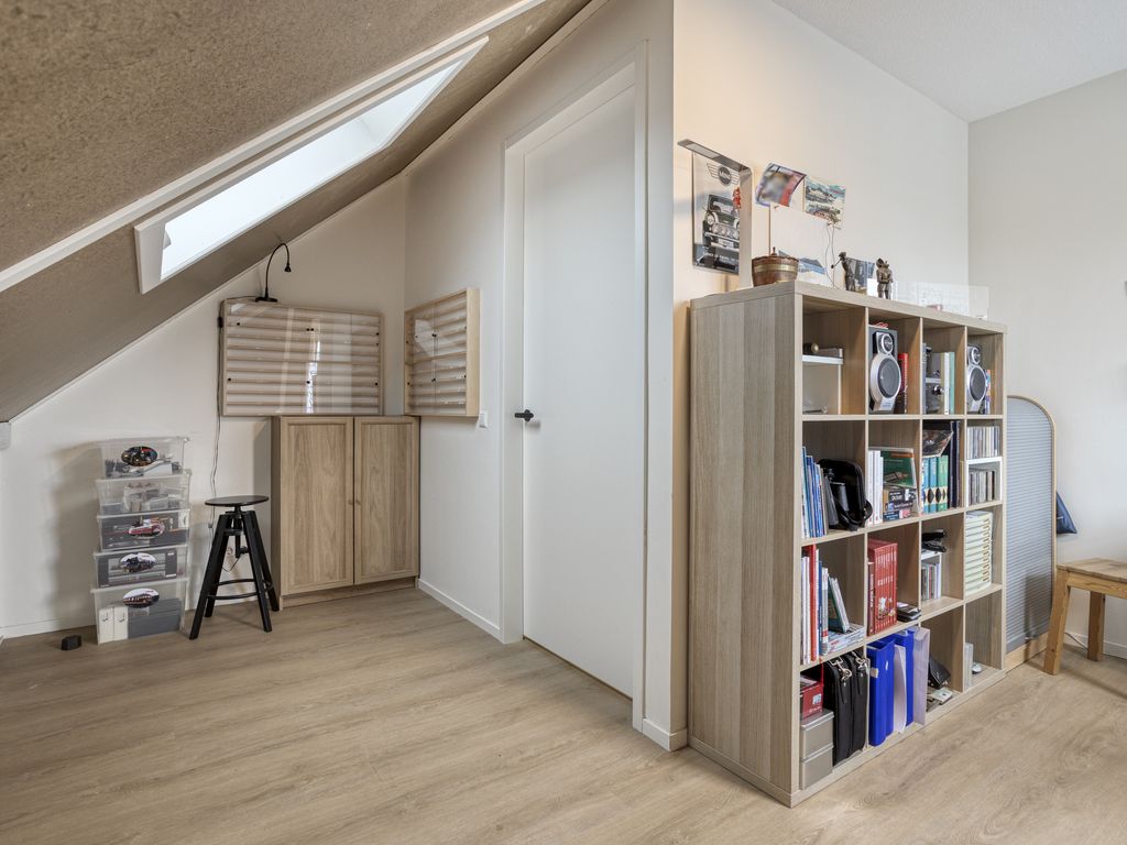 De overloop geeft toegang tot drie ruime slaapkamers en de badkamer. De grootste slaapkamer bevindt zich aan de voorzijde en profiteert van extra lichtinval door zijramen en is voorzien van rolluiken.