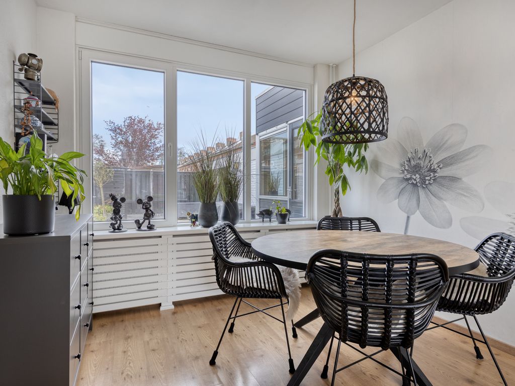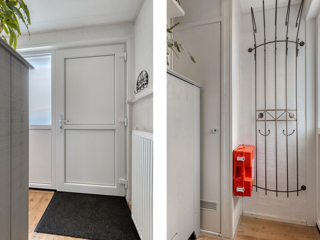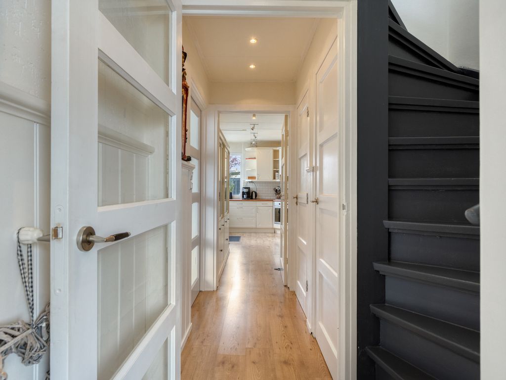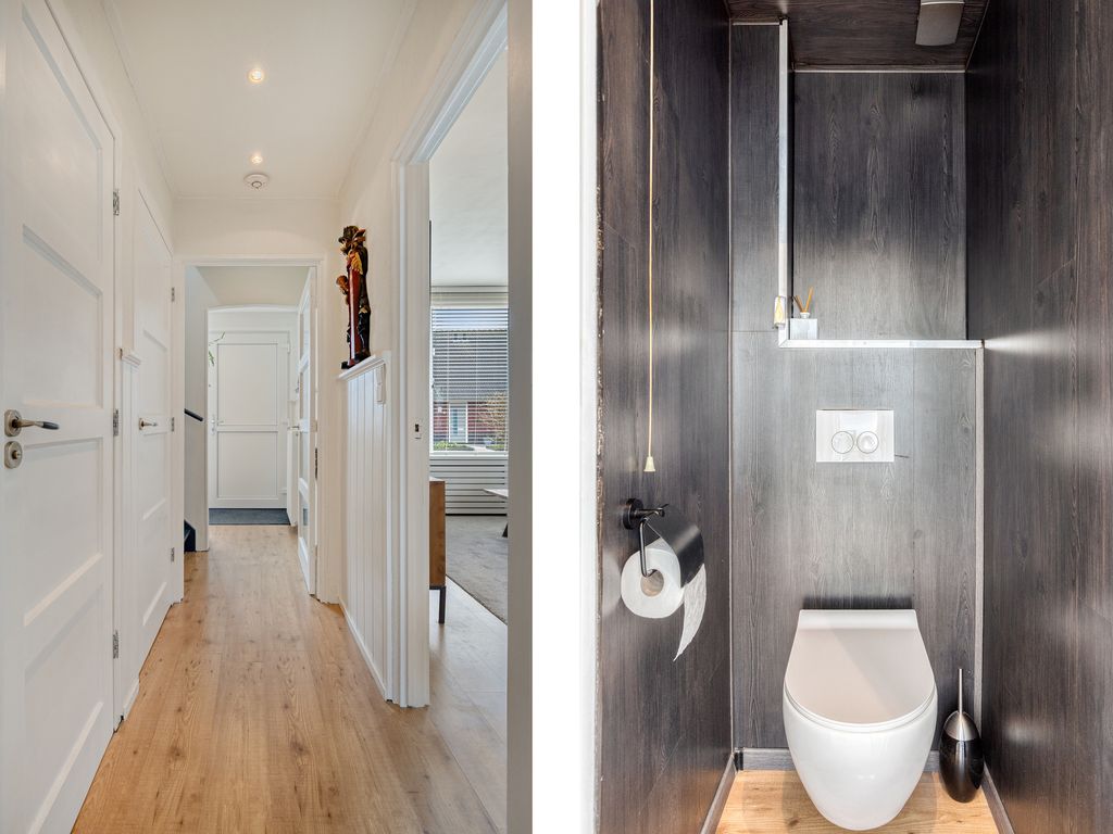 De hal biedt toegang tot de meterkast, trapkast, moderne toiletruimte met wandcloset, de trapopgang en het woon- en keukengedeelte. De combinatie van een houten lambrisering en stijlvolle binnendeuren geeft de woning een verzorgde uitstraling. De houtkleurige laminaatvloer loopt naadloos door over de gehele begane grond.