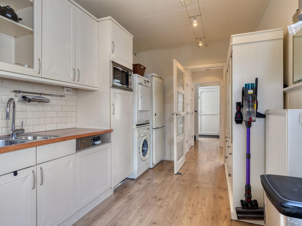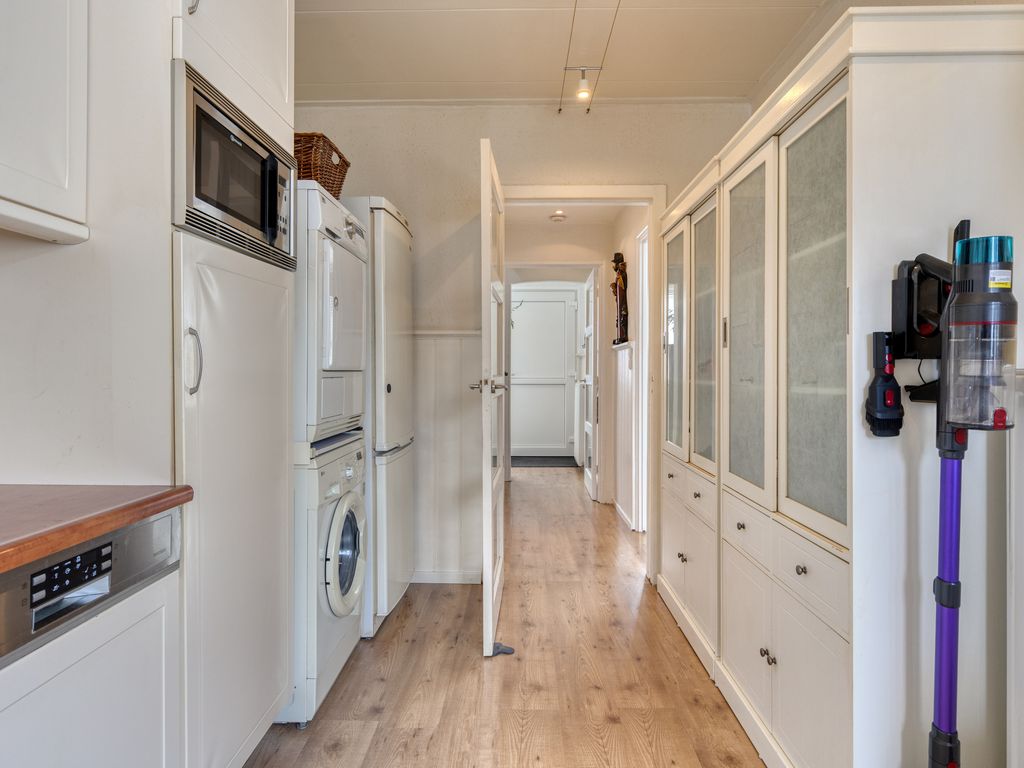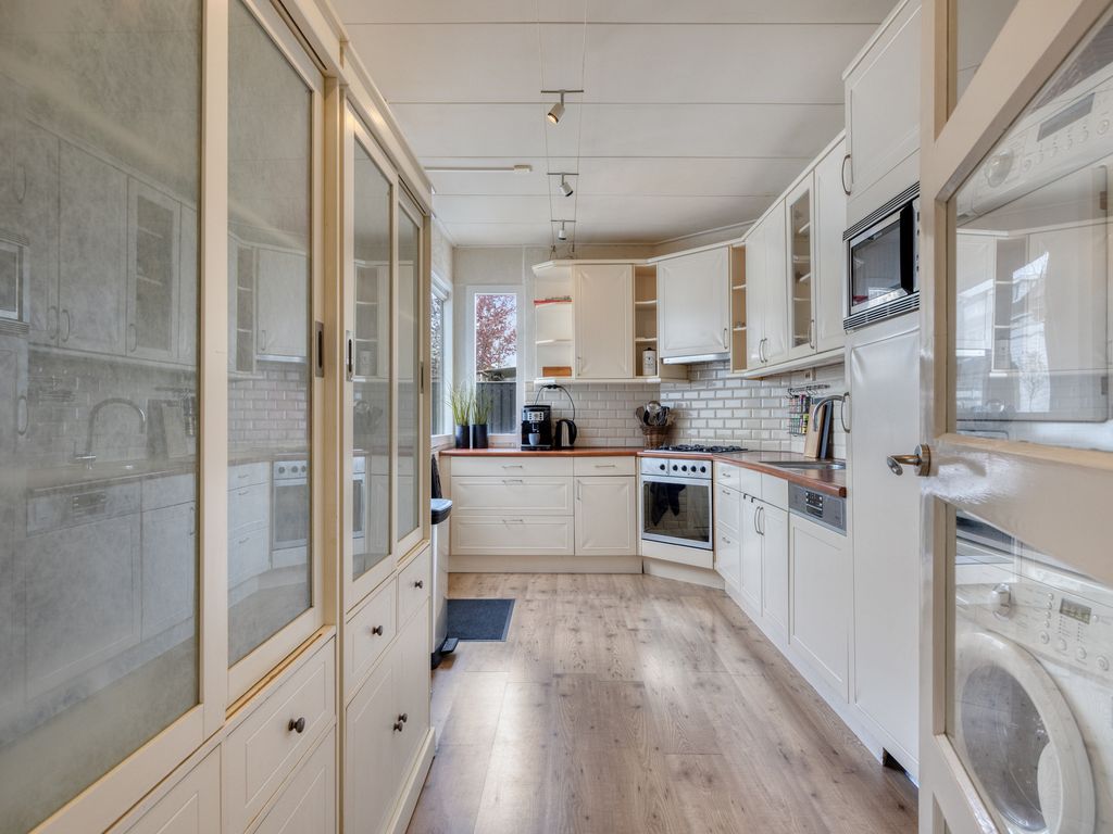 De uitgebouwde keuken in L-opstelling is bereikbaar vanuit de hal en biedt volop ruimte. De keuken is voorzien van diverse inbouwapparatuur, waaronder een gaskookplaat, afzuigkap, oven, magnetron en vaatwasser. Tevens is er ruimte voor witgoed en een koel-vriescombinatie. Grote raampartijen en een achterdeur zorgen voor veel lichtinval en directe toegang tot de tuin.