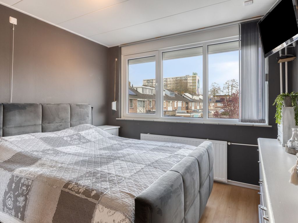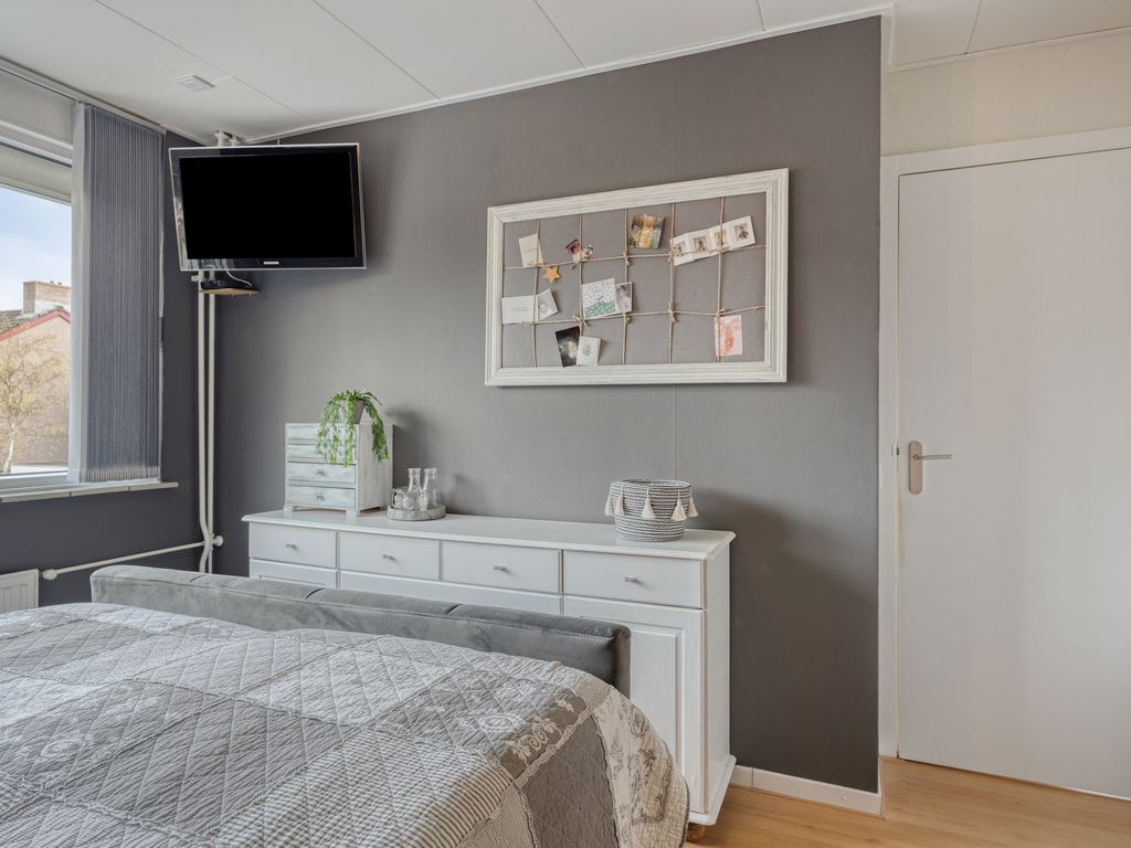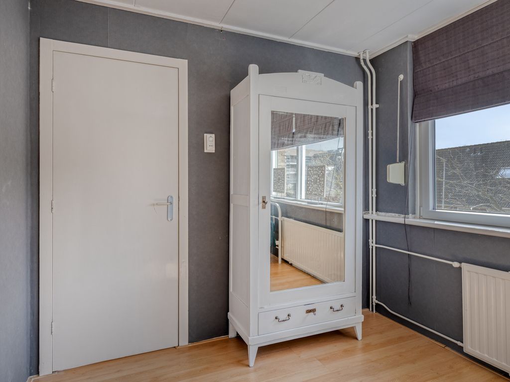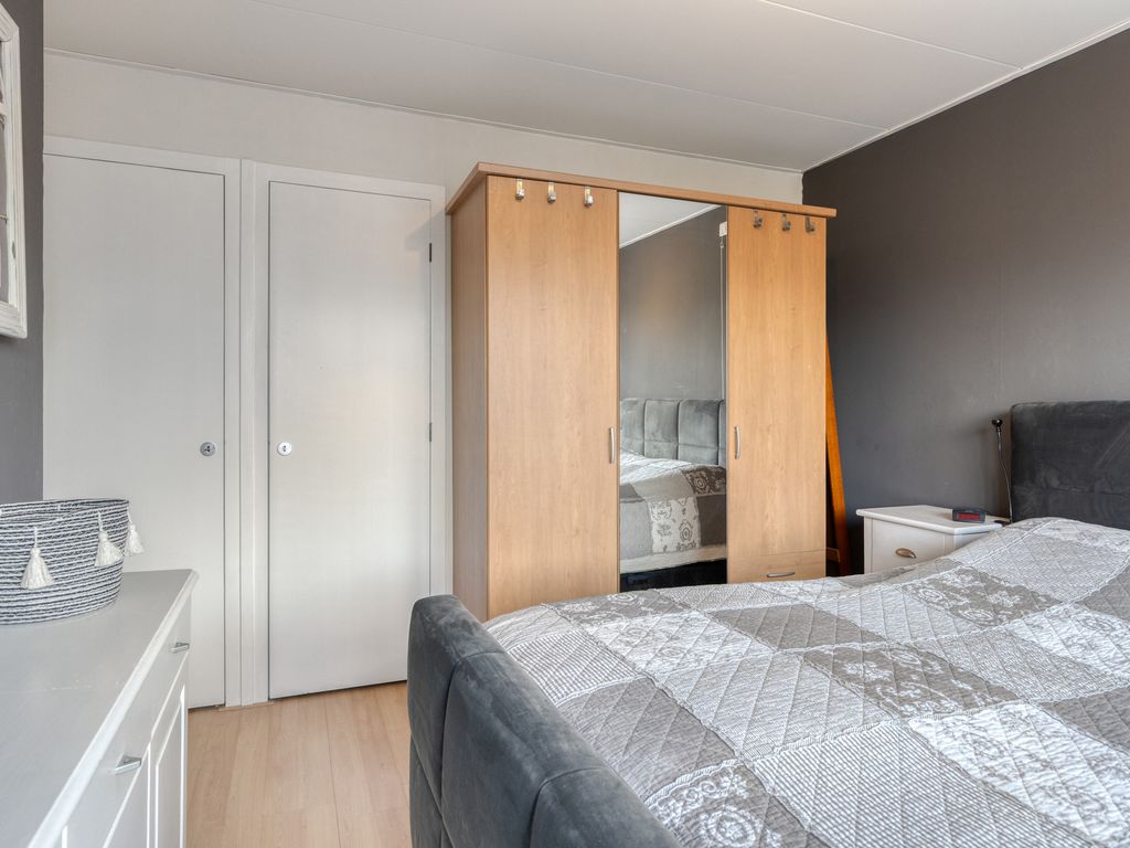 De overloop geeft toegang tot drie slaapkamers, een bergkast en de badkamer. Aan de achterzijde bevinden zich een ruime slaapkamer met inbouwkast en een tweede, kleinere kamer. Aan de voorzijde ligt de derde slaapkamer, eveneens met inbouwkast. Alle slaapkamers zijn voorzien van rolluiken. De badkamer is praktisch ingericht met een ruime douche en een wastafelmeubel. De gehele verdieping (m.u.v. de badkamer) is afgewerkt met een doorlopende laminaatvloer.