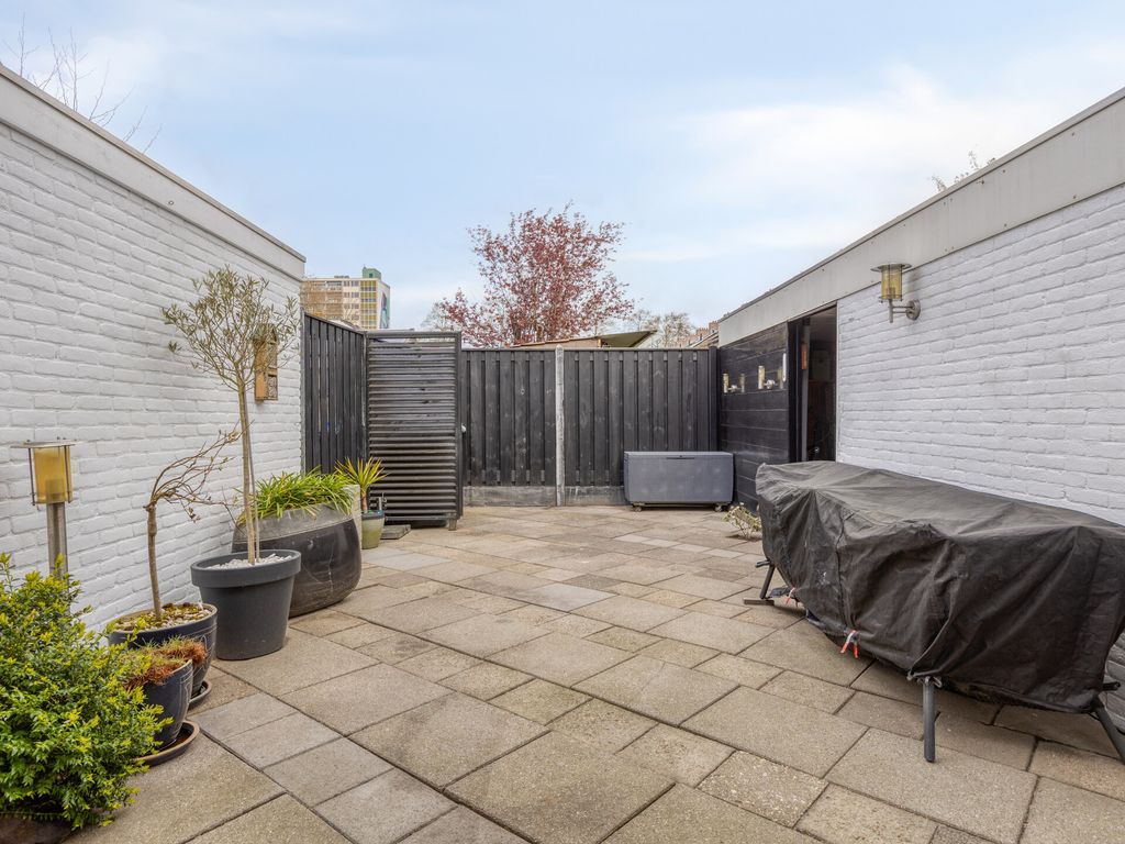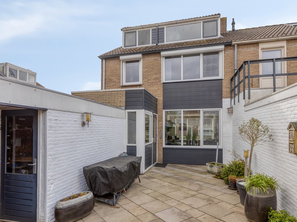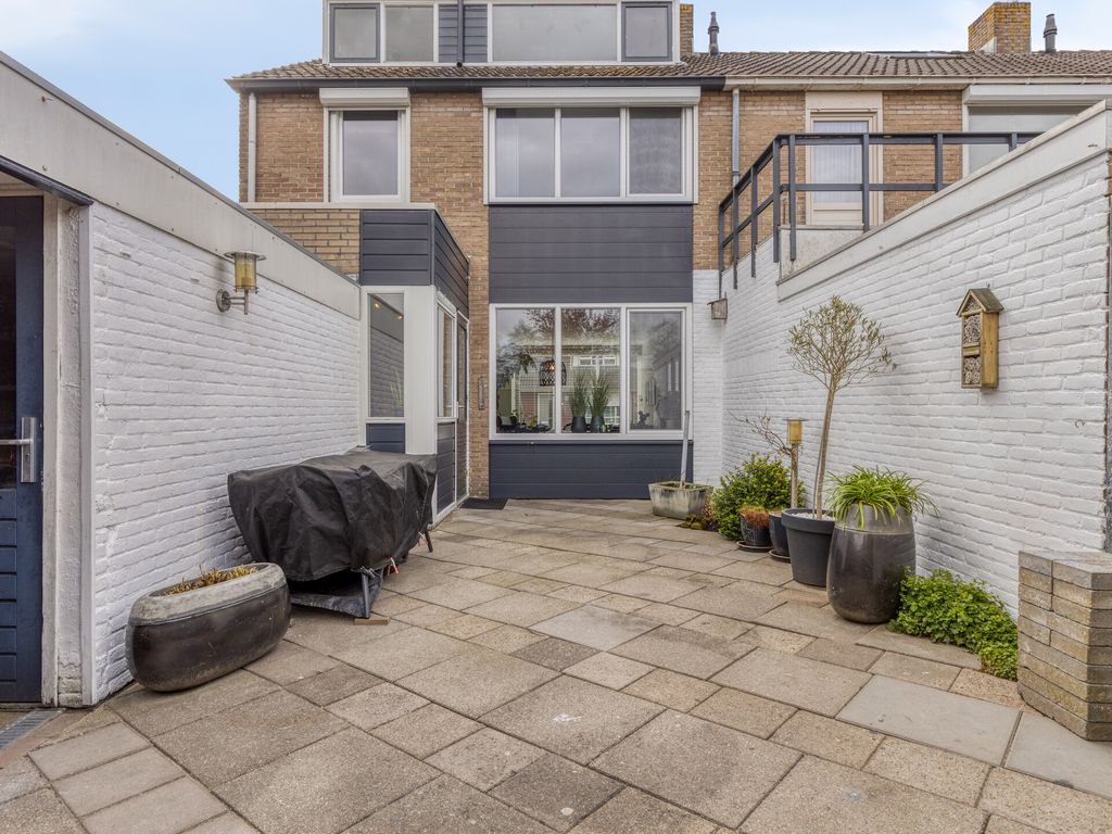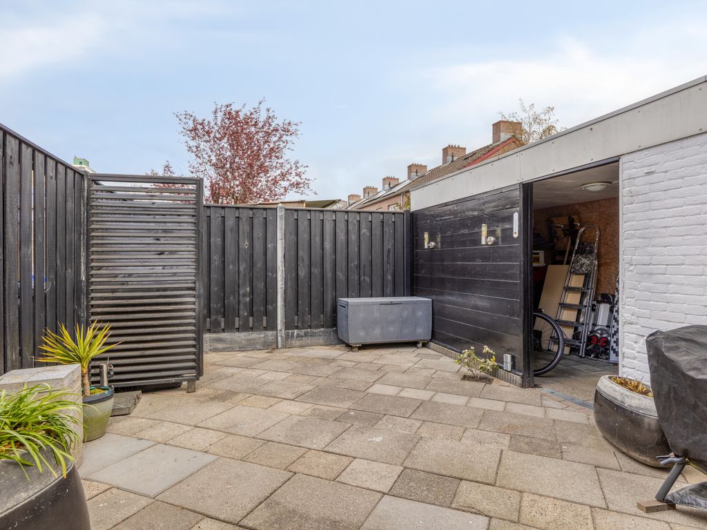 De onderhoudsvriendelijke achtertuin is grotendeels bestraat en aangevuld met groen in potten. Direct achter de woning bevindt zich een stenen berging met aansluitend een houten overkapping — ideaal voor fietsen of opslag.