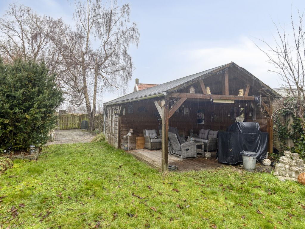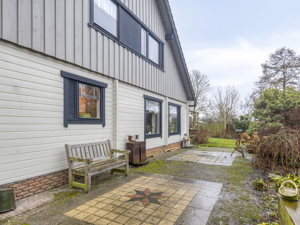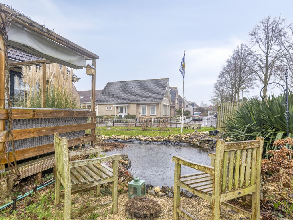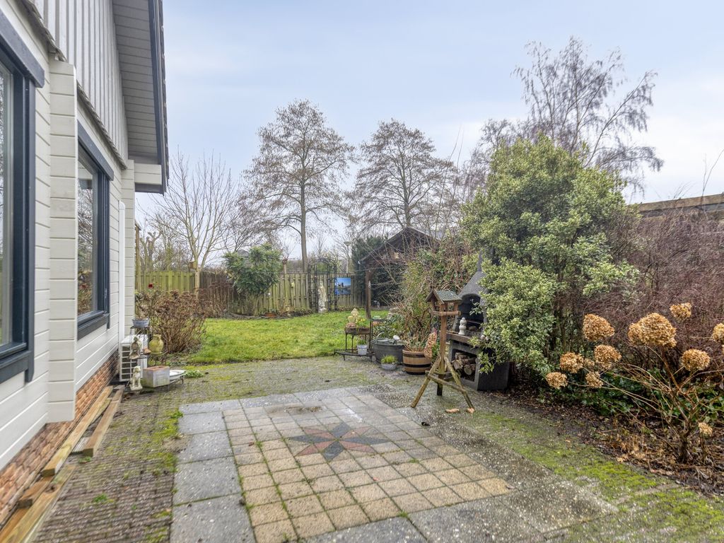De woning staat midden op een ruim perceel, met een tuin rondom. Via een achterom is de woning goed bereikbaar en aan de voorzijde is parkeergelegenheid op eigen terrein. Direct achter de woning bevindt zich een groot bestraat terras met aansluitend de tuin en een royale vijver. Naast de woning ligt een verhoogd houten terras met mooi uitzicht over de tuin. Ook aan de zijkant is de woning voorzien van een fraaie vijverpartij. Achterin de tuin bevindt zich een houten veranda met aangrenzende ruime berging. Hierachter ligt een afgeschermde stalling waar u een caravan of camper uit het zicht kunt plaatsen. Aan de rand van de tuin wordt een kleine strook grond van de gemeente gehuurd, deze huur is eventueel over te nemen. Direct naast de woning ligt een grote speeltuin, ideaal voor de (klein)kinderen.