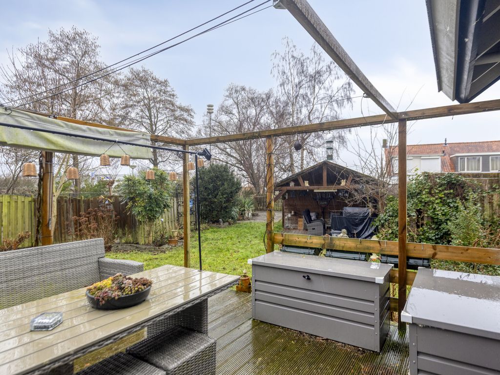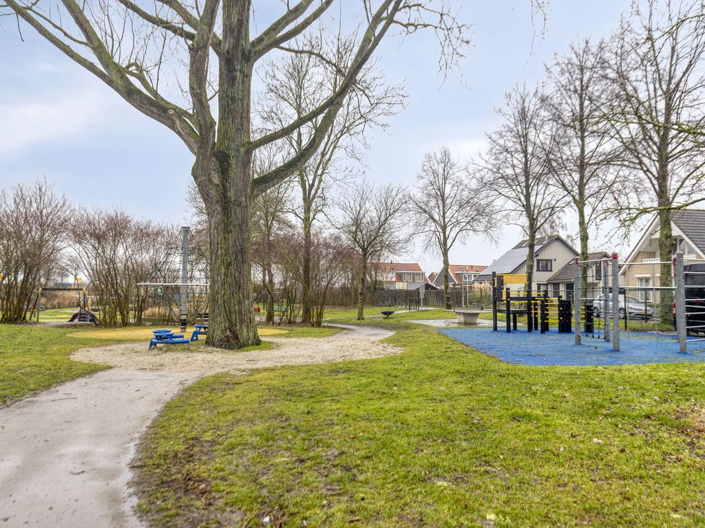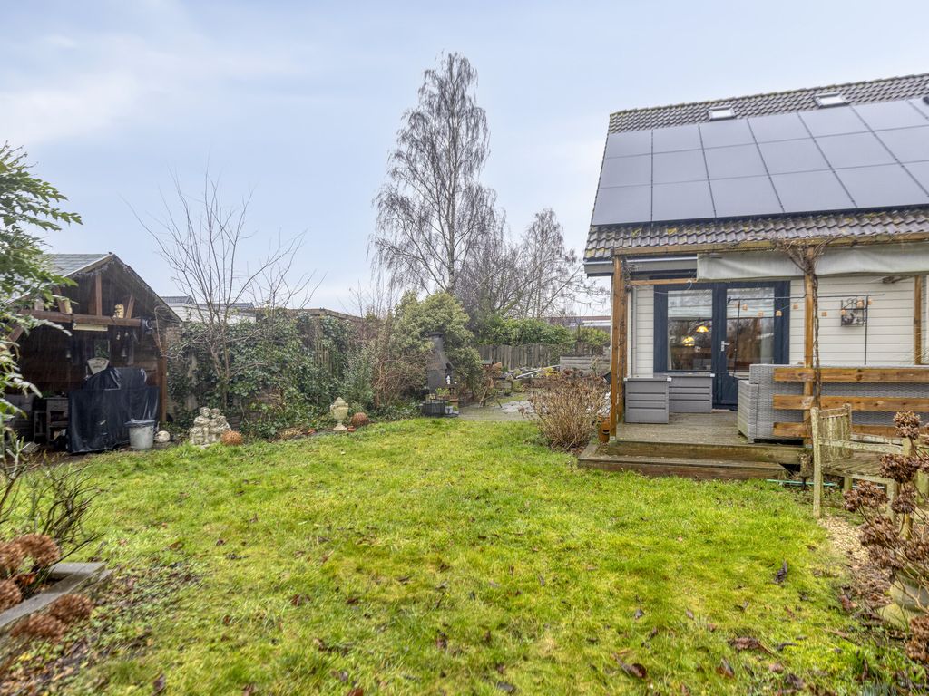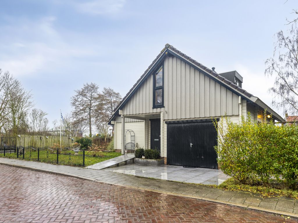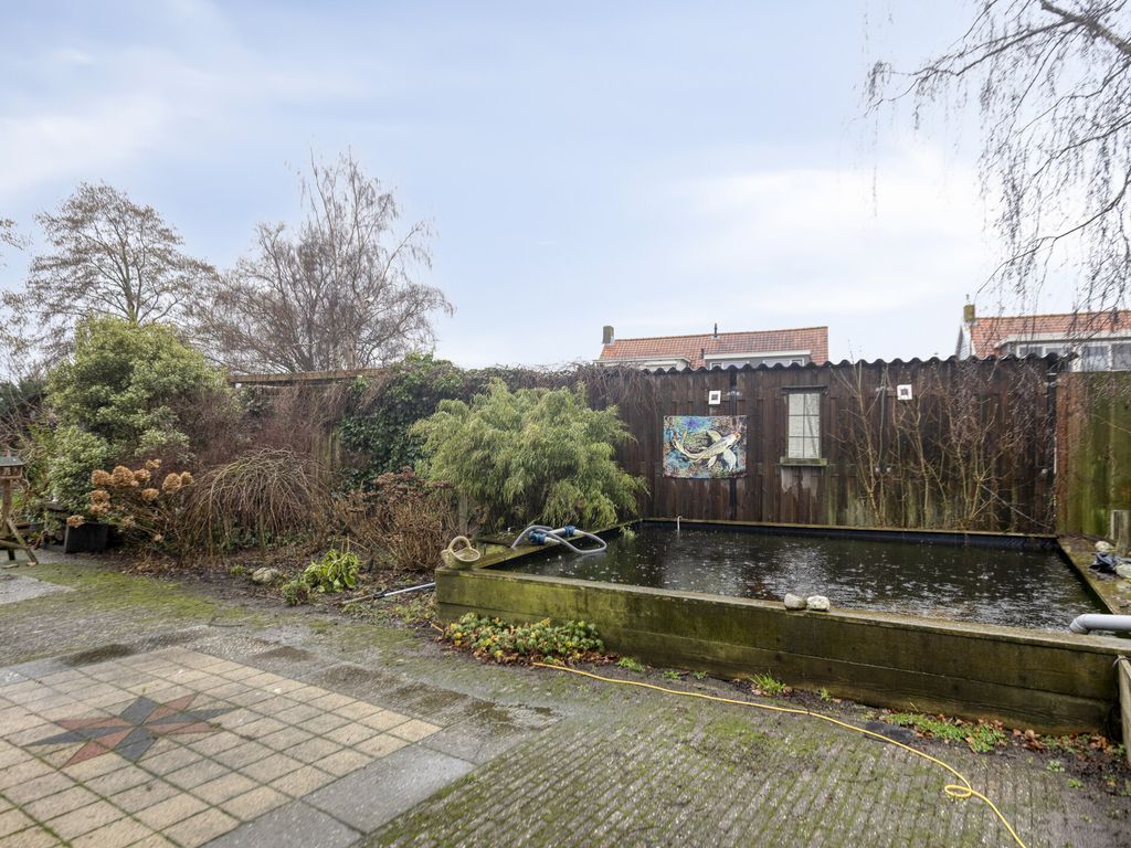 De woning staat midden op een ruim perceel, met een tuin rondom. Via een achterom is de woning goed bereikbaar en aan de voorzijde is parkeergelegenheid op eigen terrein. Direct achter de woning bevindt zich een groot bestraat terras met aansluitend de tuin en een royale vijver. Naast de woning ligt een verhoogd houten terras met mooi uitzicht over de tuin. Ook aan de zijkant is de woning voorzien van een fraaie vijverpartij. Achterin de tuin bevindt zich een houten veranda met aangrenzende ruime berging. Hierachter ligt een afgeschermde stalling waar u een caravan of camper uit het zicht kunt plaatsen. Aan de rand van de tuin wordt een kleine strook grond van de gemeente gehuurd, deze huur is eventueel over te nemen. Direct naast de woning ligt een grote speeltuin, ideaal voor de (klein)kinderen.