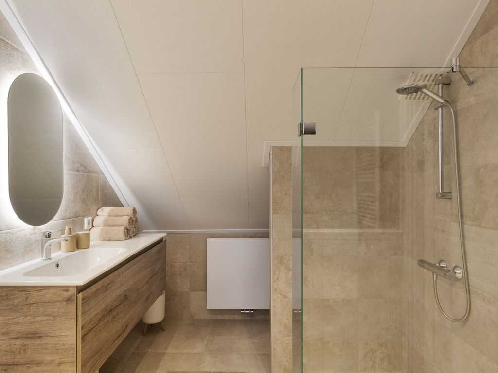 Vanaf het bordes bovenaan de trap is de badkamer bereikbaar. Deze is vrijwel nieuw en voorzien van modern tegelwerk, een wastafelmeubel met spiegel, ruime inloopdouche en een toilet. Aansluitend bevindt zich aan de voorzijde de vierde slaapkamer, een ruimte die eventueel ook uitstekend kan dienen als werkkamer of hobbyruimte.