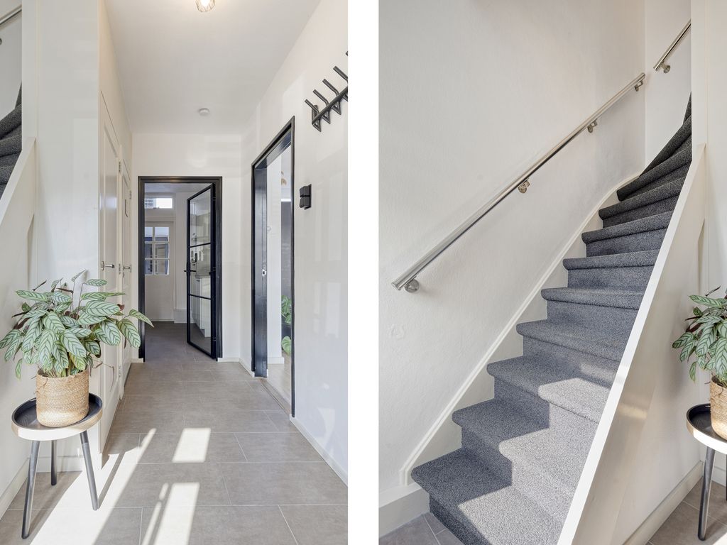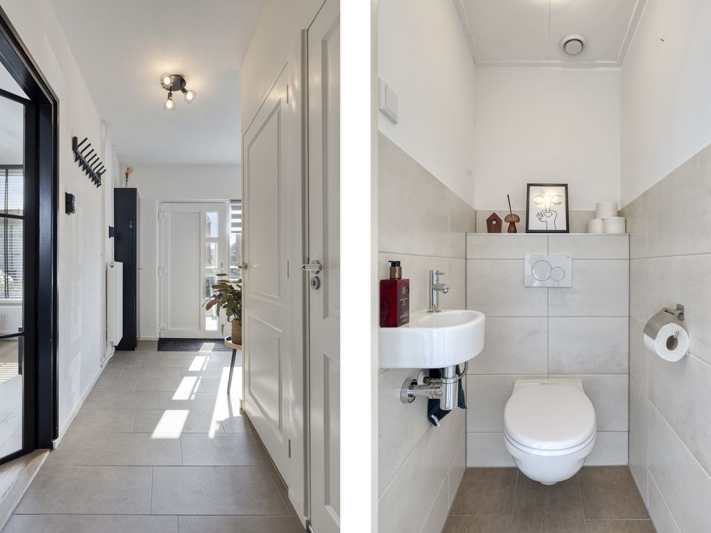 U betreedt de woning aan de voorzijde in de hal met meterkast, een modern toilet met fonteintje en een praktische trapkast. Vanuit hier heeft u toegang tot de woonkamer en de keuken.