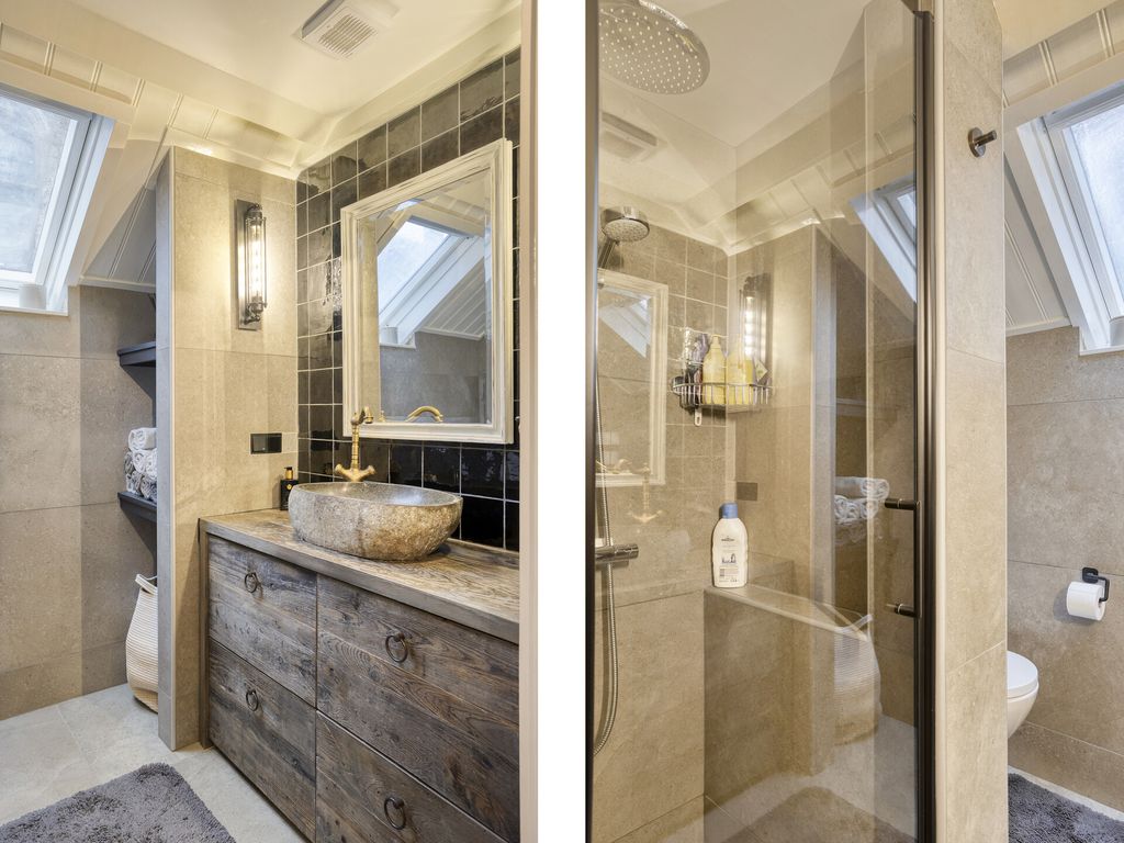 De badkamer ligt centraal op de verdieping en heeft dankzij het dakraam een mooie lichtinval. De ruimte is voorzien van een inloopdouche met glazen deur, een toilet en een stijlvol meubel met waskom en bijpassende kraan. In een handige nis kunnen handdoeken en wasmand netjes worden opgeborgen.