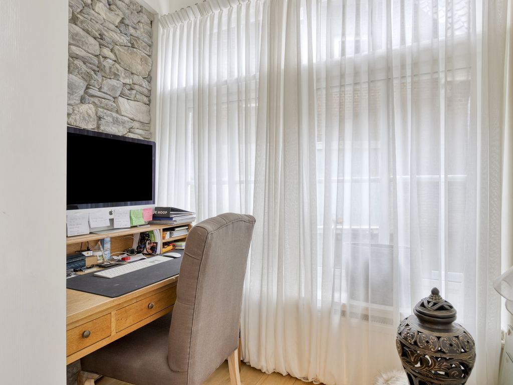 De woonkamer straalt rust en geborgenheid uit. Lichte kleuren, een prachtig balkenplafond, grote ramen en een authentieke stenen wand creëren een serene, warme sfeer; een plek waar je graag thuiskomt. Aan de voorzijde is een knusse thuiswerkplek gecreëerd, in directe verbinding met de woonkamer. De klassieke ramen zorgen voor veel daglicht en zijn in de meeste gevallen voorzien van voorzetramen, zodat zowel sfeer als warmte behouden blijven. De houten vloer en massief houten details boven deuren en bij de trap geven de woonkamer extra karakter. De stenen muur, die een belangrijk onderdeel vormt van de uitstraling, loopt door in de keuken, overloop en slaapkamer en verbindt zo de ruimtes tot een harmonieus geheel.