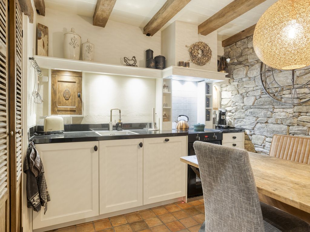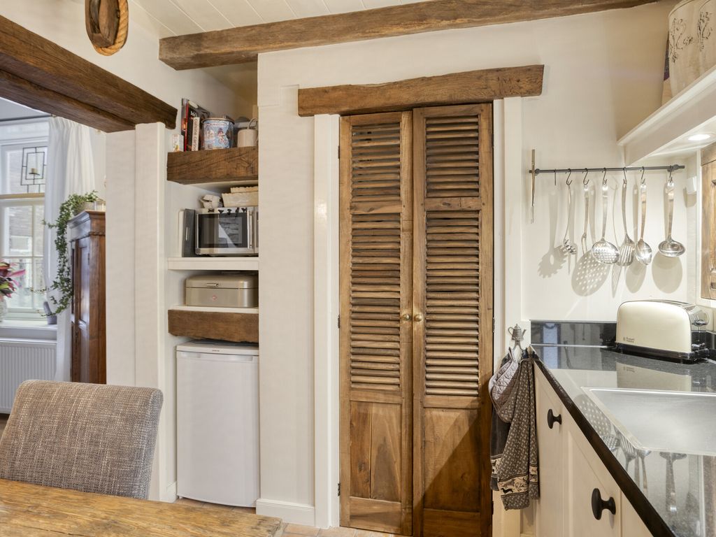 De keuken bevindt zich aan de achterzijde en is compact maar praktisch ingericht. De lichte kleuren en het donkere granieten blad vormen een mooie combinatie, terwijl het balkenplafond en de tegelvloer het geheel extra warmte geven. De keuken is voorzien van moderne apparatuur: inductiekookplaat, afzuigkap, oven, vaatwasser, koelkast en een losse vriezer. Er is voldoende ruimte voor een 4 persoons eethoek. Via charmante louvredeuren bereikt u een handige inbouwkast waar ook de wasmachine en droger zijn opgesteld.