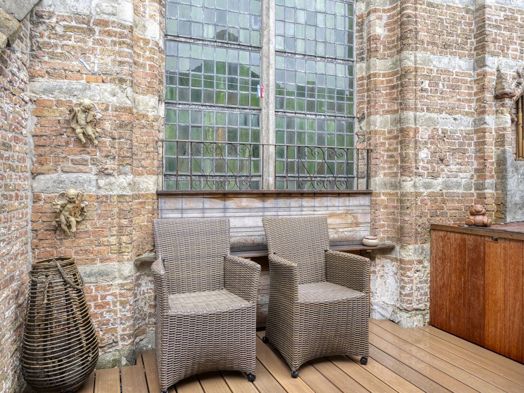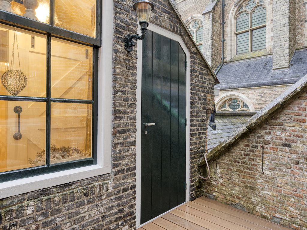 Het dakterras ligt boven de keuken, beschut tussen de woning en de kerk, hier geniet u in het voorjaar en in de zomer het grootste gedeelte van de dag heerlijk van de zon. Tijdens de renovatie is het dak van de keuken volledig vernieuwd en is het terras voorzien van mooie vlonderplanken. Hoewel de woning geen tuin heeft, kunt u uw fiets eenvoudig plaatsen achter het hek op het terrein van de kerk. Parkeren doet u met een vergunning in de parkeergarage aan de Kolveniershof.