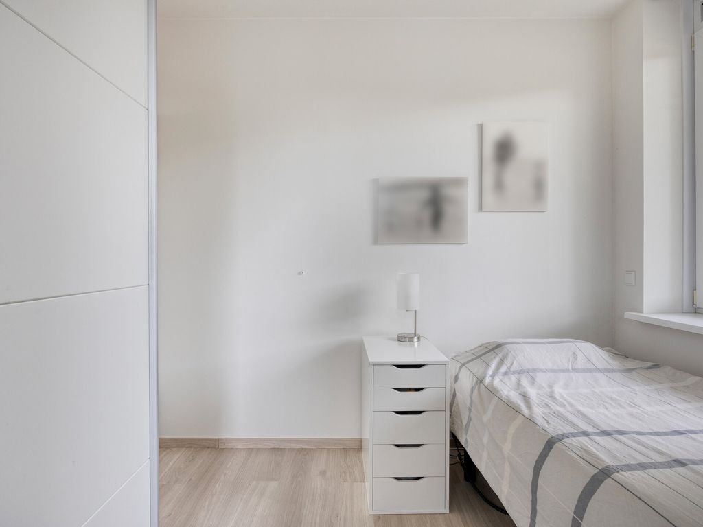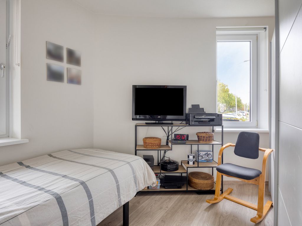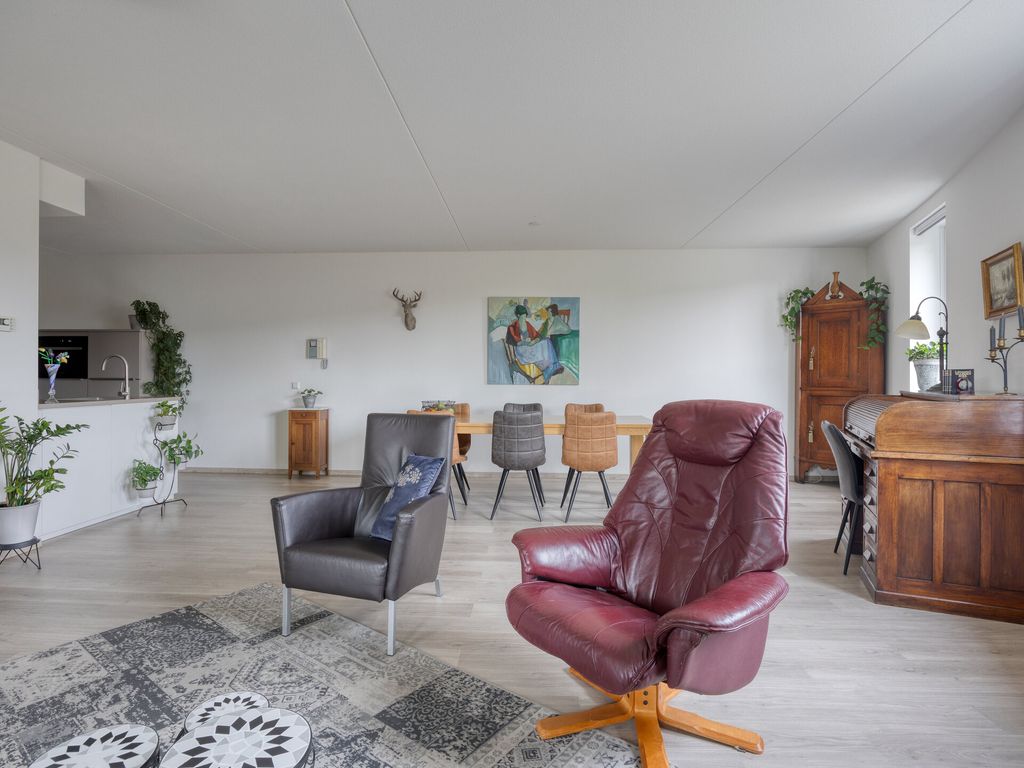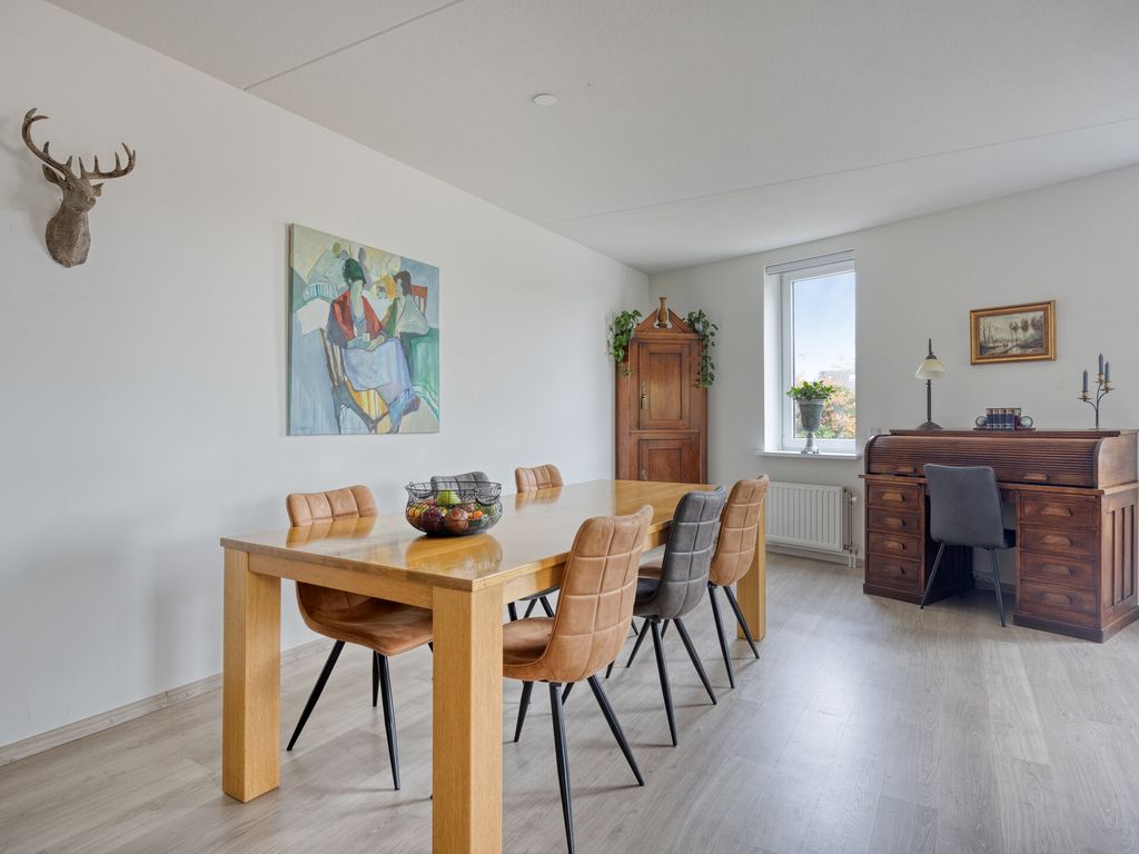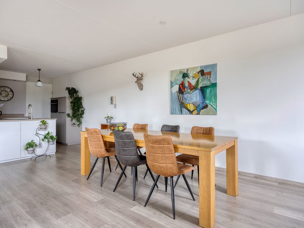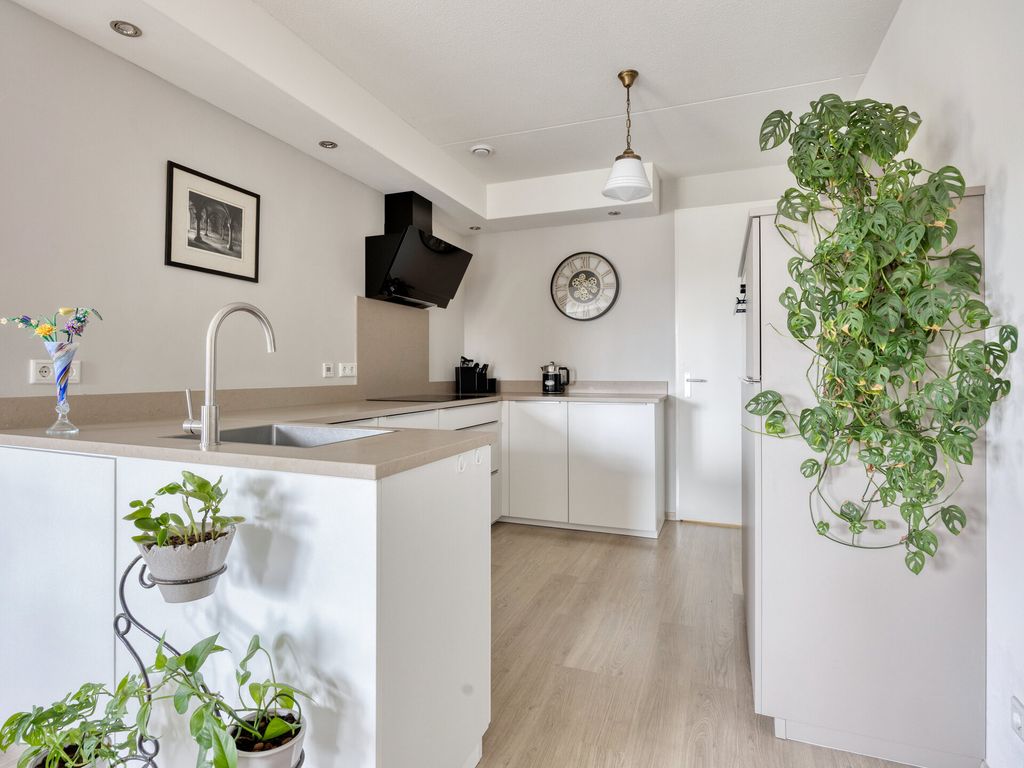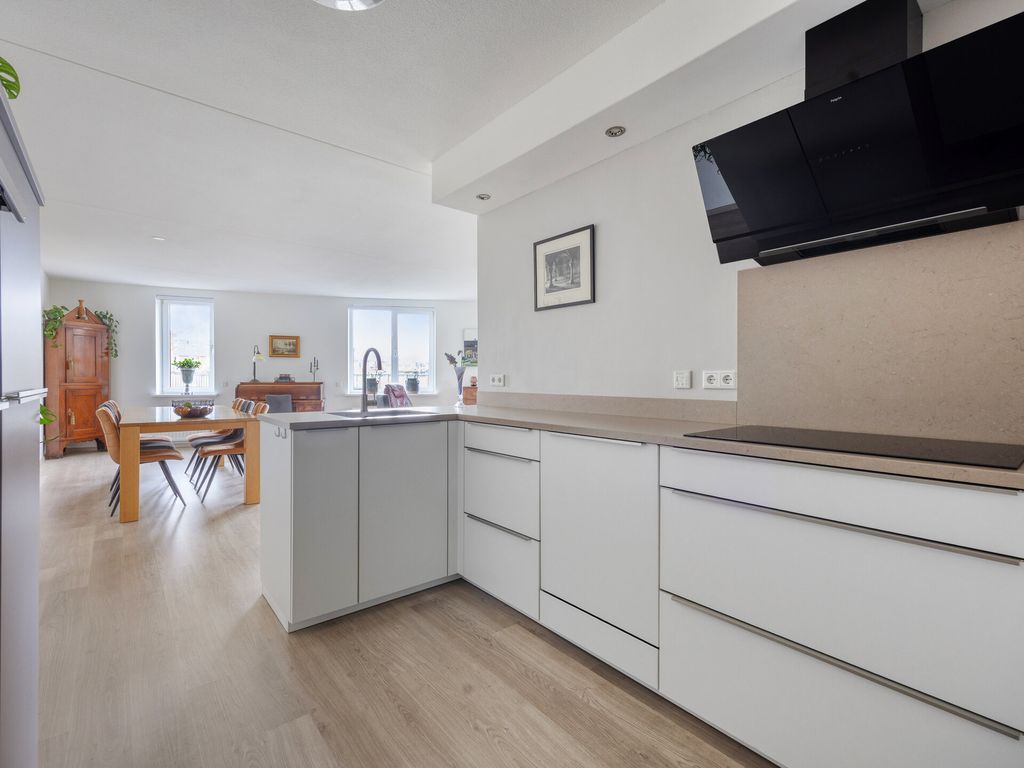 De woonkamer is royaal en licht dankzij de brede raampartijen en de schuifpui naar het balkon. De open indeling zorgt voor een fijne verbinding tussen wonen, koken en eten. De open keuken, vernieuwd in 2022, is modern uitgevoerd en voorzien van een inductiekookplaat, vaatwasser, koelkast, vriezer en combi/oven. Kortom, alles wat u nodig heeft voor comfortabel dagelijks gebruik.