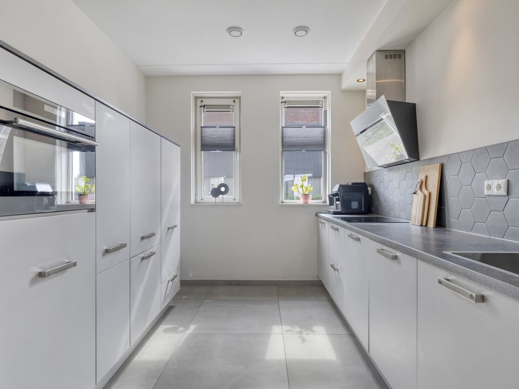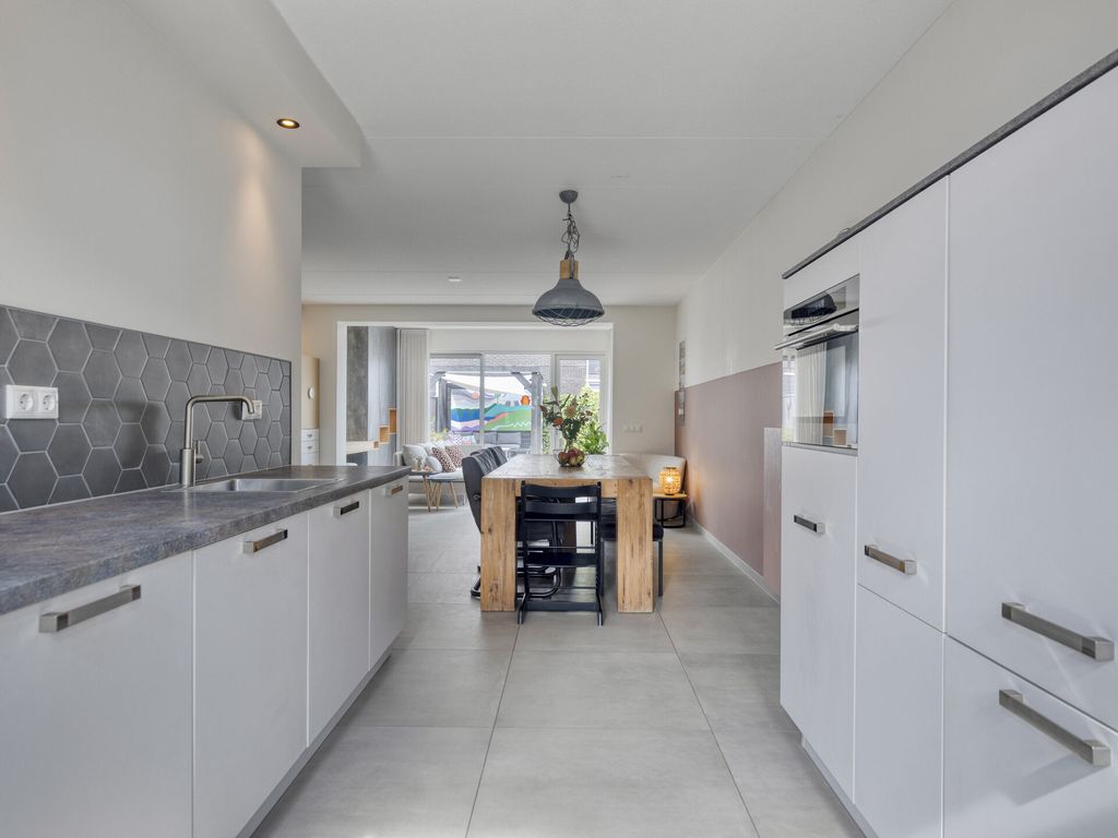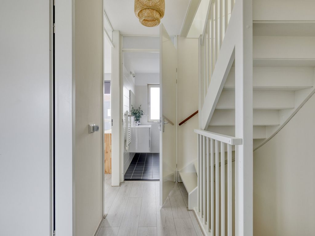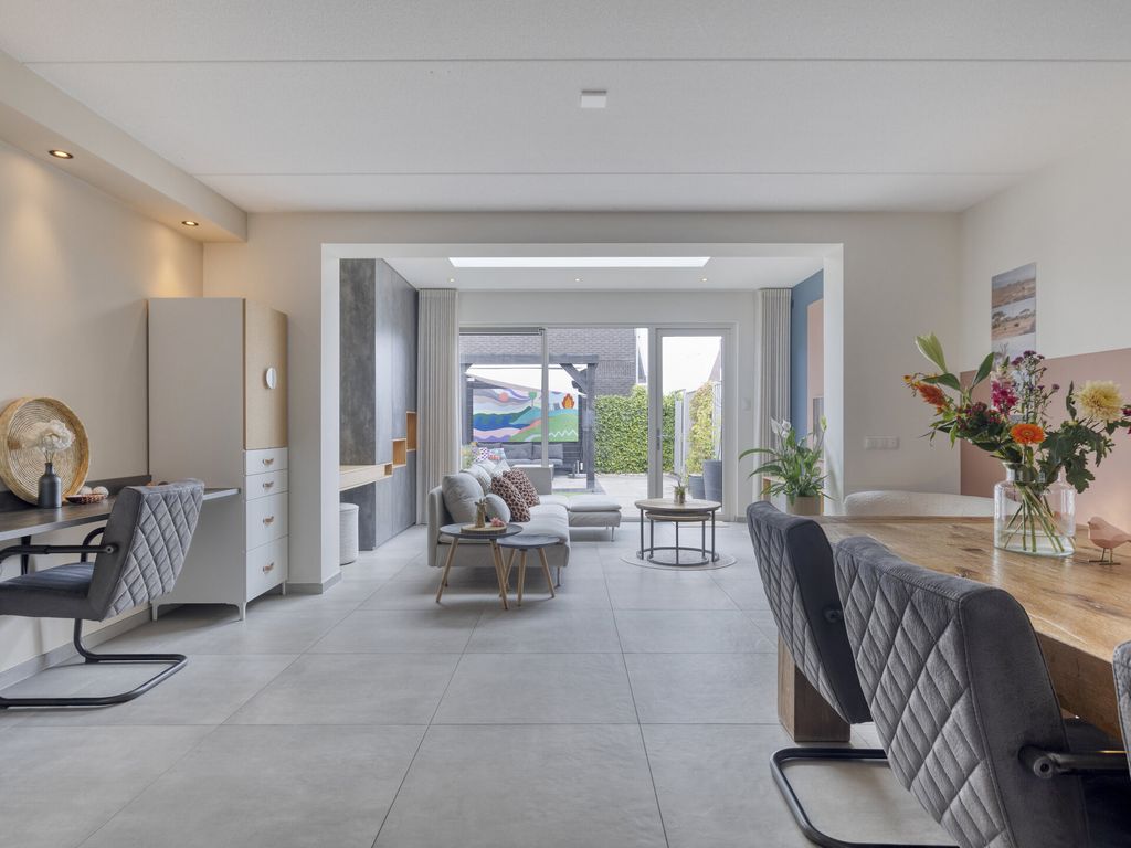 De woning betreedt u aan de voorzijde direct vanaf de stoep. In de hal bevinden zich de meterkast (8 groepen), een opbergkast met waterontharder, een moderne toiletruimte met fonteintje en de trapopgang. Vanuit de hal loopt u door naar de woonkamer: een lichte en royale leefruimte met grote raampartijen en vloerverwarming onder de lichtgrijze tegelvloer. De open keuken ligt aan de voorzijde en is modern uitgevoerd met lichte kastfronten en een grijs werkblad. De keuken is compleet uitgerust met inbouwapparatuur: vaatwasser, koelkast, inductiekookplaat, moderne afzuigkap en combi-oven. Dankzij de flinke uitbouw aan de achterzijde is er een heerlijk ruime woonkamer ontstaan met volop plek voor een grote eethoek, een speelhoek voor de kinderen of thuiswerkplek en een comfortabele zithoek. De lichtkoepel zorgt voor extra daglicht. Via de openslaande deur stapt u de netjes aangelegde en onderhoudsvriendelijke tuin in. Onder de trap bevindt zich een praktische bergruimte.
